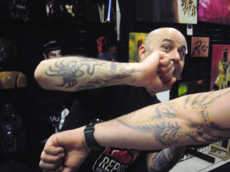 The other arm belongs to me. Me wifey snapped this pic (she is seen with the facehugger on her chest between two roller derby chicky-poo's)