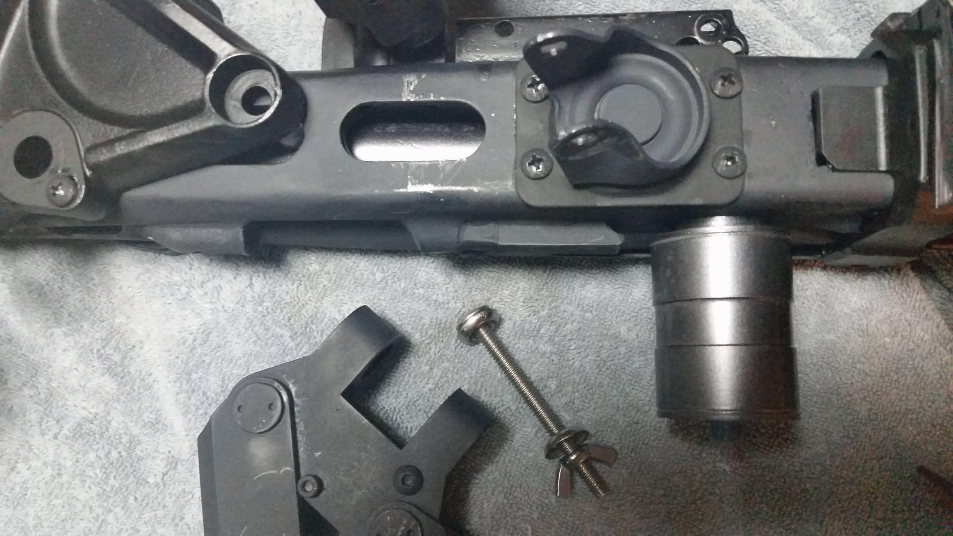 The arm is attached using a 1/4" bolt with two washers and a wingnut.