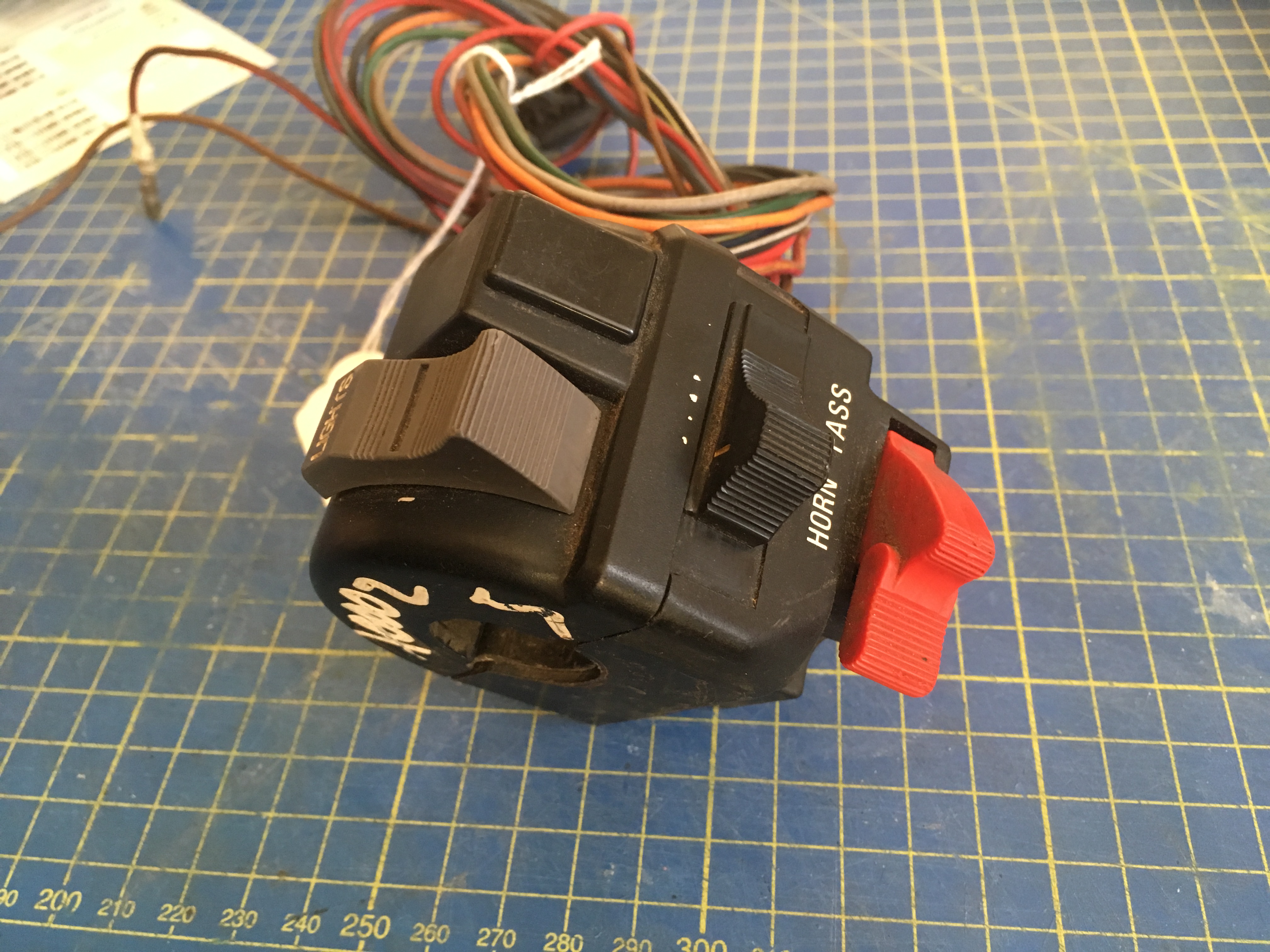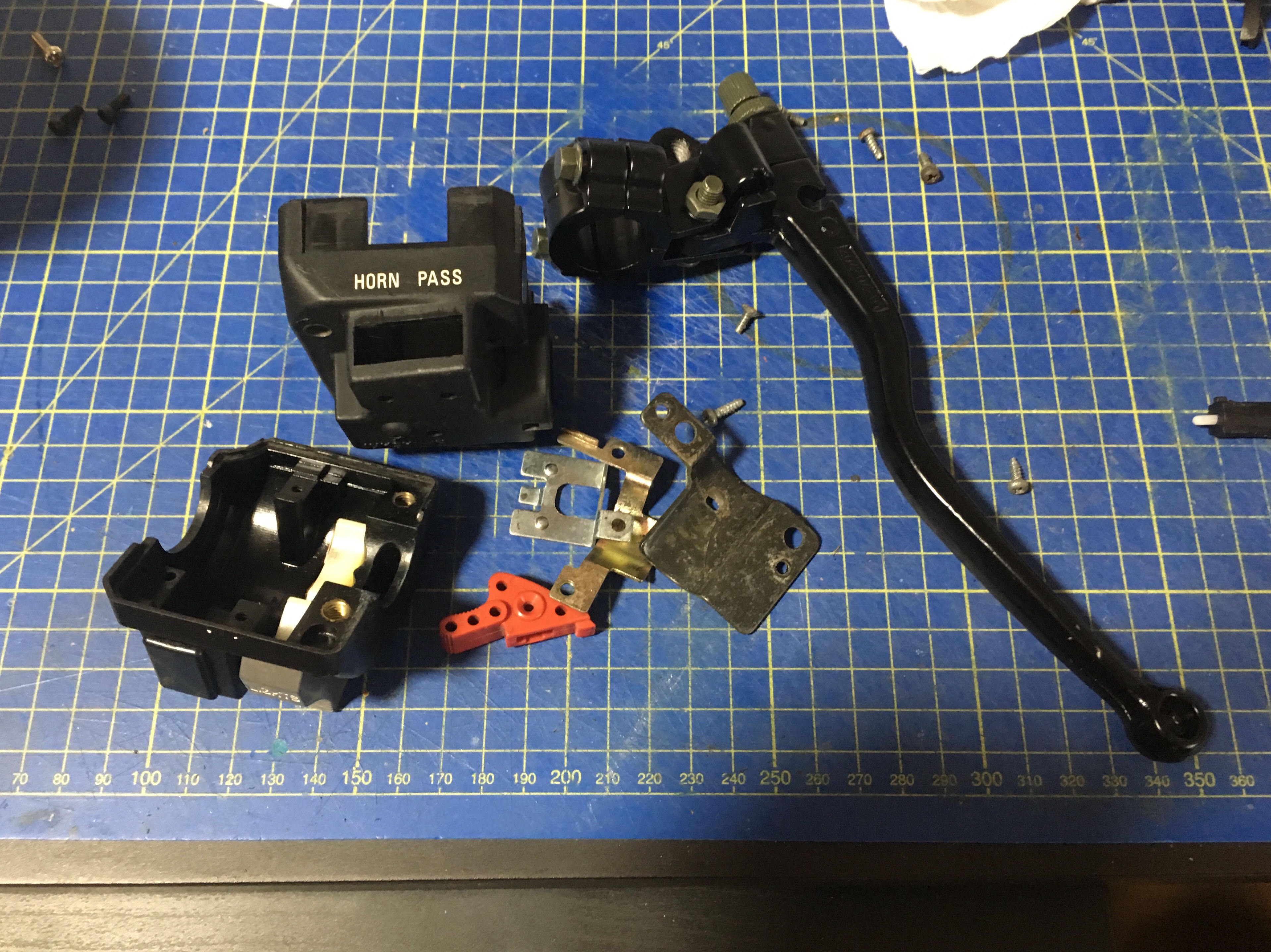 Thanks for the feedback, guys! I've taken apart the light switch to clean out all the gunk and to make sure that the electrical parts were okay. There's some corrosion on the metal brackets and the wiring is ready to be thrown out, but the rest seems solid and most of the grime came off pretty easy. Some more parts off of ebay arrived in the mail, so I now have a clutch/brake lever for the rear grip (not screen accurate and perhaps a little bit too big, but it's a start)