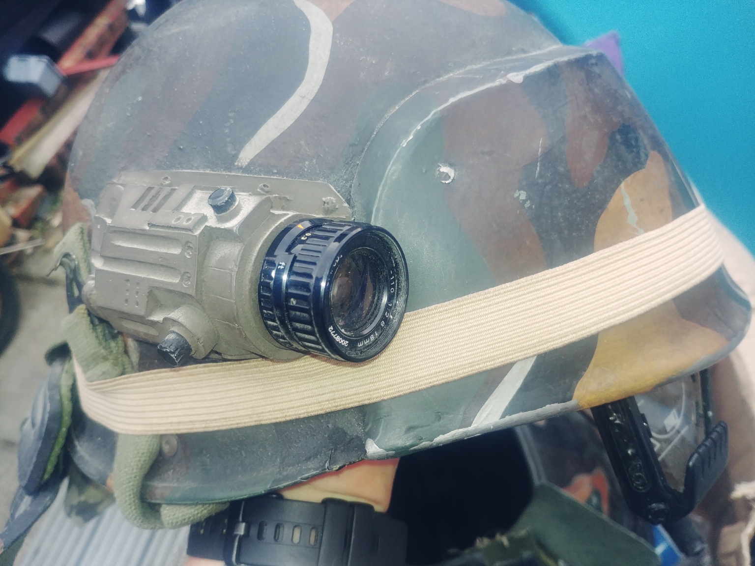 Aside from the waffle-pattern camping mat on the inside surfaces; there's a light-up dropdown sight in the ( Also fibreglass ) helmet - Either a Spatcave Studios unit, or a copy thereof, powered by 4 AAA batteries hidden in the top of the helmet; a little MAA-cam pouch under the lobster plate, and a genuine Pentax lens in the very nice resin cast camera.