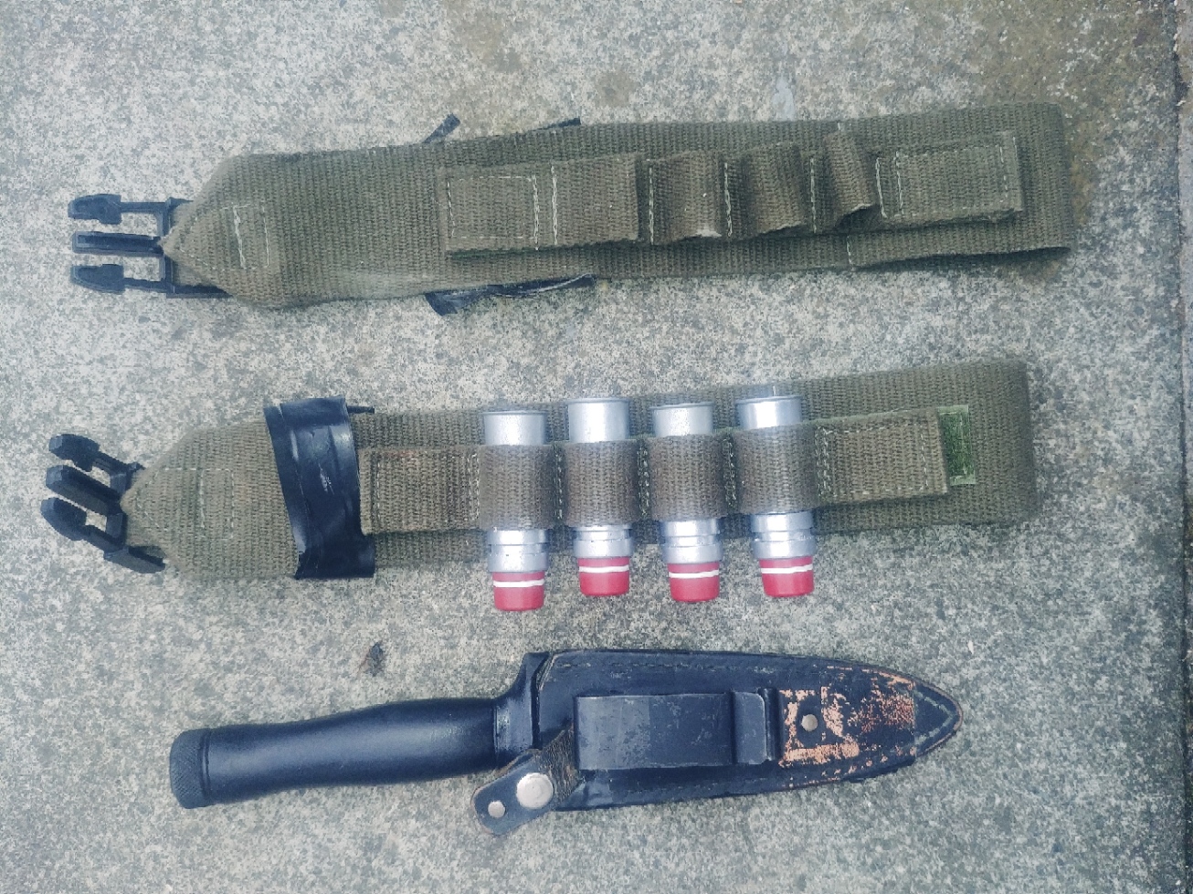 The straps have a bunch of grenades, all resin with a nice metallic paintjob, and a replica rubber knife in a real leather sheath; and there's a very nice shoulder-lamp consisting of a resin box/handle/arm assembly, with a real Reflecta lamp, properly reconfigured to the filming setup and wired to a D-cell battery box.