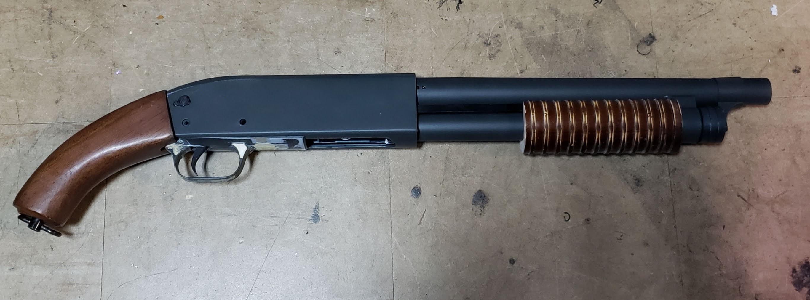 I had an A&K Airsoft 870 I wasn't doing anything with so I decided to convert it to an Ithaca M37. It's not a perfect conversion but it's definitely good enough for costuming and the gun is still functional for Airsoft.