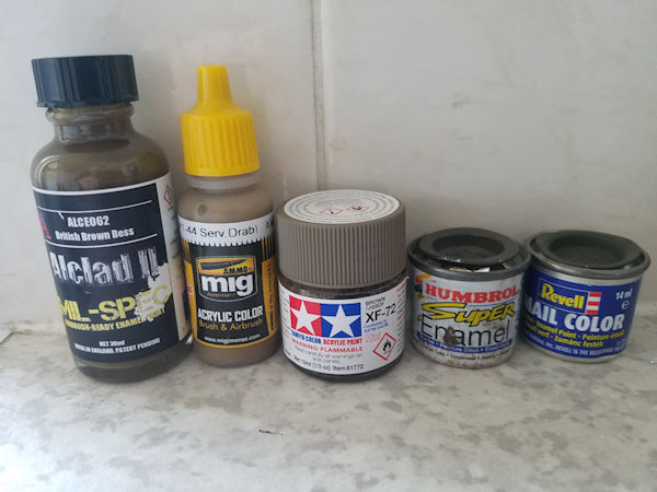 The Revell Nato Olive, which is often suggested as an alternative to Brown Bess, appears way too Green and I don't think looks anything like it. The Halfords Brown Camoflage Spray paint was way too dark.