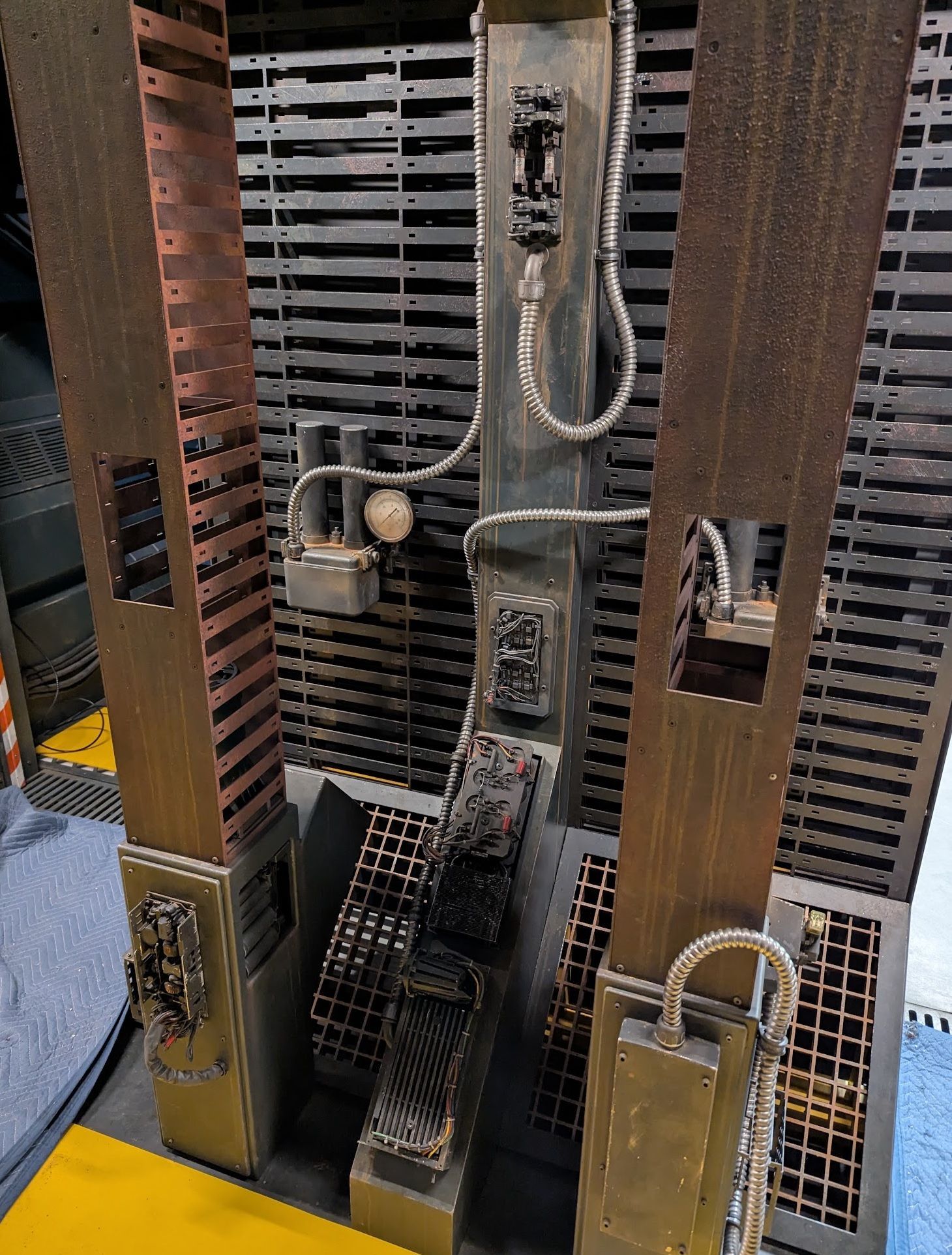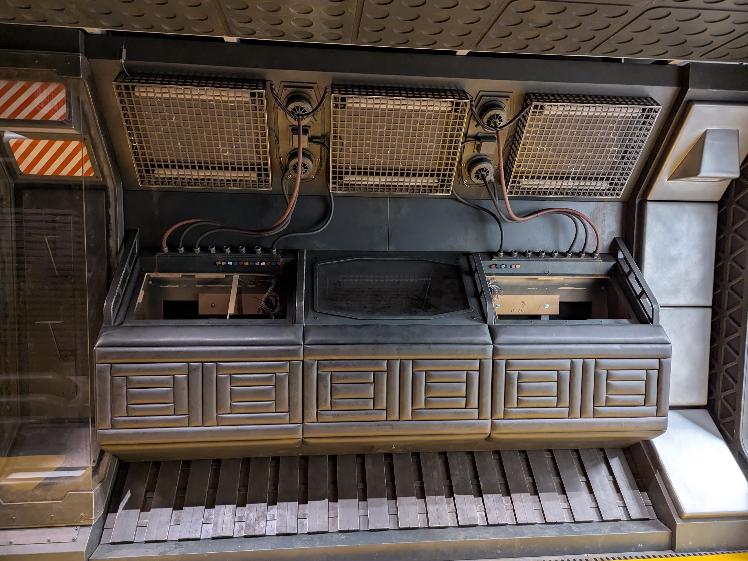 Wiring up the vestibule consoles & video screens. All the lights respond in some way to the buttons, switches & dials. Since we're talking about lighting, it's worth noting that when it's lit up brightly like this, it's because we have the service lights on, which are out-of-fiction lights hidden in the corridor for when we need plenty of light to work by. In this particular photo, we also have the in-fiction vestibule lights on as well.