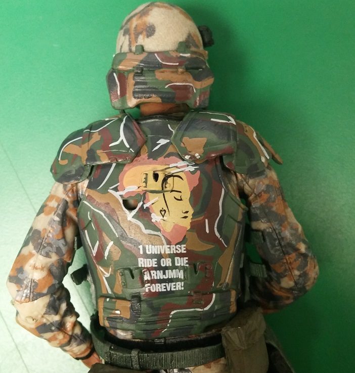 In a bit of a twist, check his grafitti on his back. 100% NOT screen accurate, so it must have been requested by Ricco. Maybe the face on the continent of Africa is his wife's face (to cancel out the tribute to a long forgotten 'Heather' on the front?? :lol: :wink: )