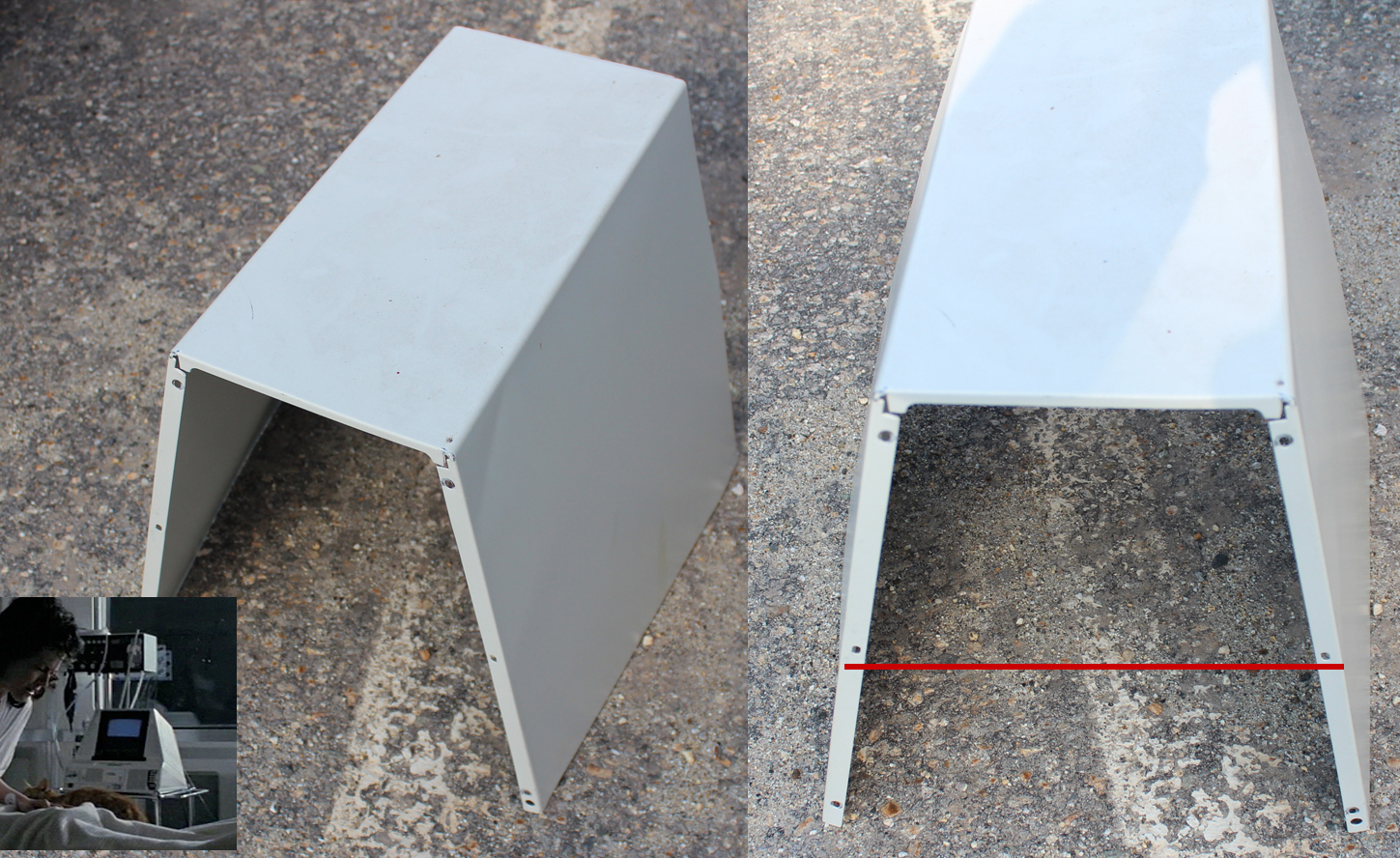 Here's a possibility for the outside shell of the Vidcom. I was so busy looking at the PC monitor shell I didn't even consider the computer's mainframe! I would cut the sides to match the overall shape, and the front panel would come up to where I've drawn the red line. The width at the very top is 7.25", from there it is adjustable based on how far I bend the metal. :twisted:
