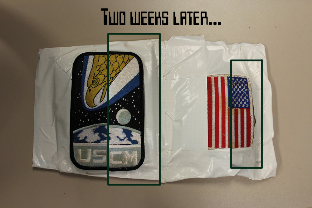Since I hadn't gotten around to sewing these on yet, I decided to try a little Sun aging. I folded the sleeves up as much as possible, and then covered the remainer with duct tape. I then stuck them on a piece of cardboard to make it easier to move around. I'll throw this on my dashboard while I'm at work for a week or two and see what comes of it.