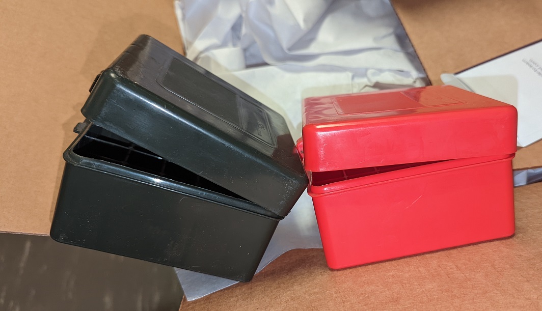 They look identical to the modern 20g boxes, but are of course slightly larger.   They came in green and red.   As you can see the brand and markings are all identical.  Just need to find the 'old style' to get the screen accurate box.