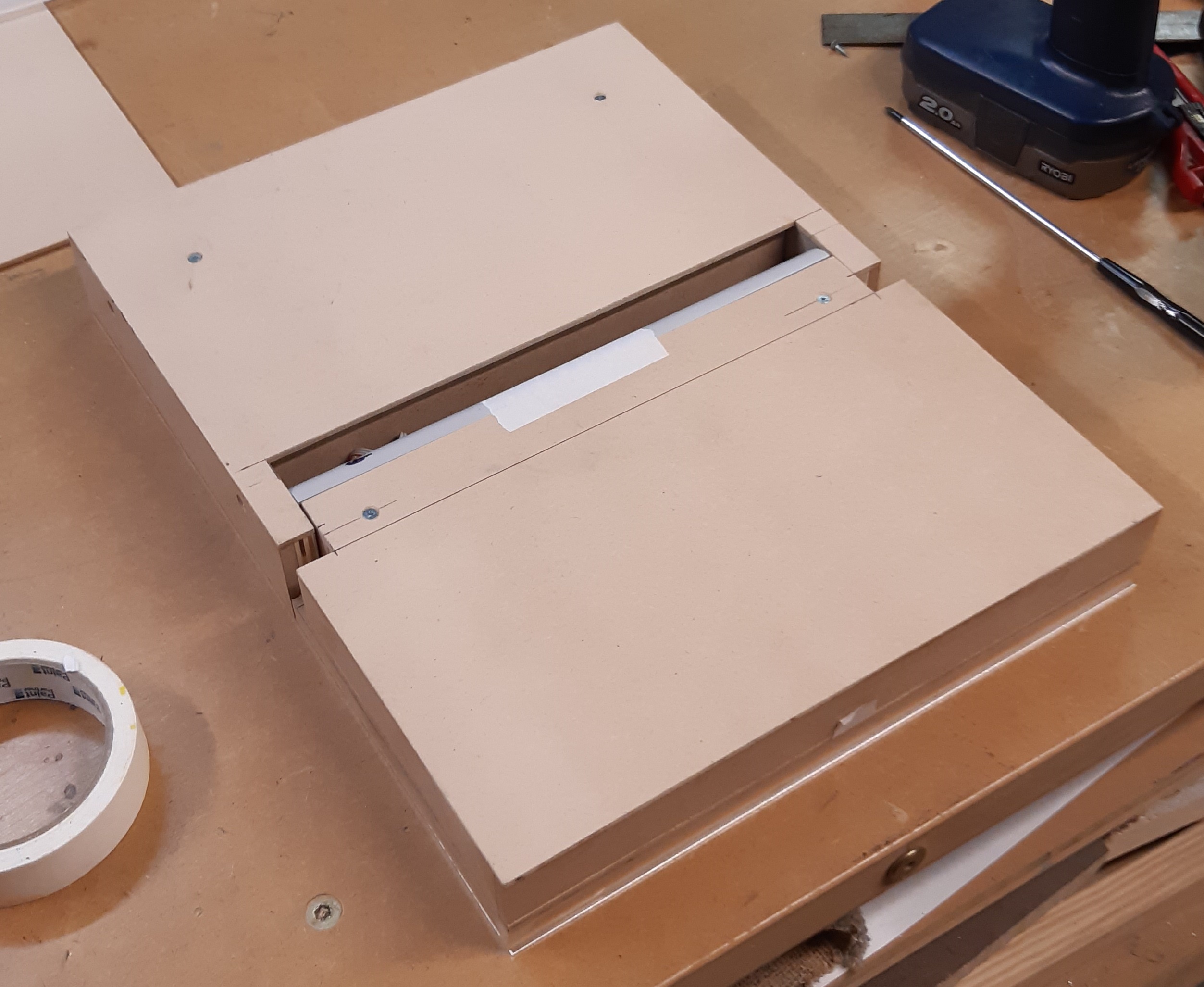 While waiting for my test swatch from Spoonflower to arrive I've put together a Grid Compass laptop :). Made from MDF, aluminium and some PVC pipe. I've cut down an old keyboard and used a 7" digital photo frame for the display. All things I had in the workshop = cheap build. Considered making it functional but figured a video playing on the frame would be all it needs to do. Plugs and switches mounted to the rear panel, some for the frame operation/charging and others just for looks.