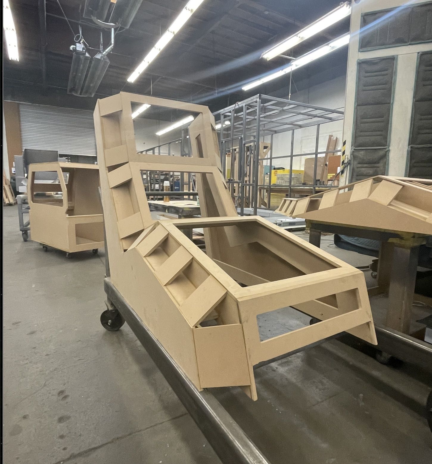 Meanwhile, we started to move forward on the upholstery. Here we're testing the shapes of the upholstery sections on the flight chair. This let us sit on it and see how it felt.
