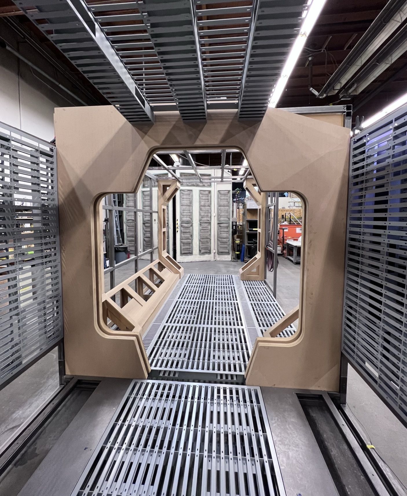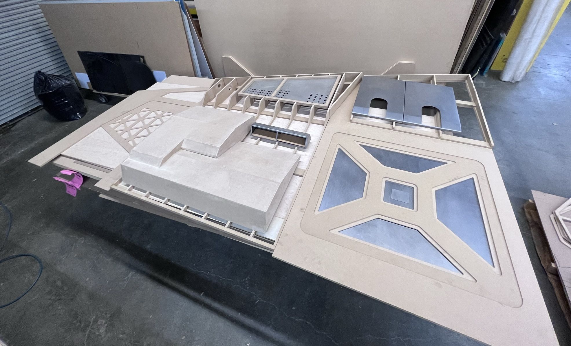 Meanwhile, we'd finished priming a whole ton of the metal wall & floor pallets. In the back, you can see a box full of cables and other junk. While we were fabricating, we were also collecting boxes of old wiring, cabling, and electronics junk. We'd be using it wherever we could later in the build to achieve our weathering and high frequency detail goals.