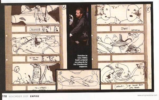 Just a little sidenote to discussion about Storyboards, from last months Empire magazine. Ridley Scott's storyboards of the Chestburster scene. Although Ridley probably took about 3 seconds to draw each, even I could manage drawings like this!