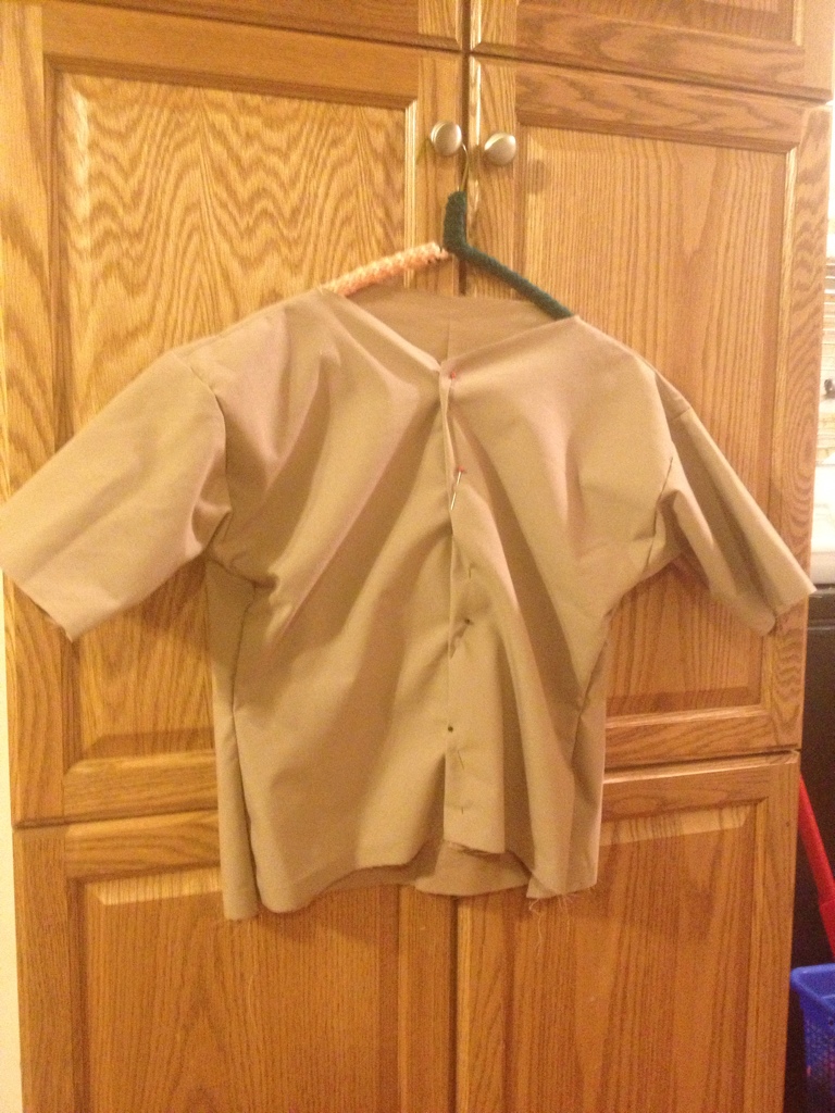 We used the new material and made the shirt from the pattern I designed. All that's left now is sewing the name tapes on and the buttons. We did the hemming, the collar, sewed the pockets on and sewed the rank patch on the sleeve, and did the button holes tonight. It's like 3AM now though haha