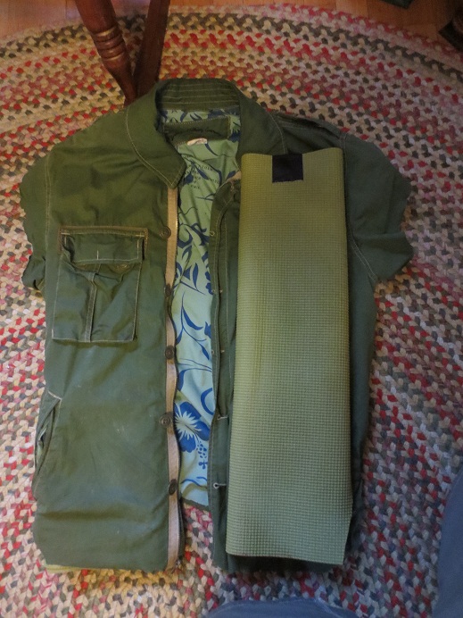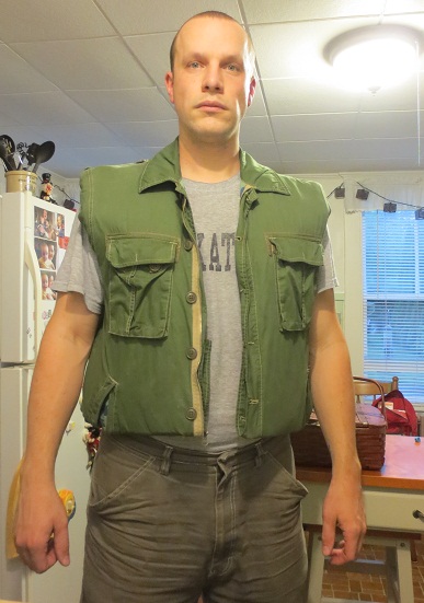 It would probably make an okay Gorman overcoat in a pinch, but I have a more radical idea, what if I could make a Flak vest out of it? If I take off the sleeves and shorten the length I would have the basic shape all set as well as plenty of material for making the padded collar and wide placket down the front. I'm thinking two layers of yoga mat would give the rigidity I'd need. I have a bunch of spare waxed canvas with eyelets already in place that I scavanged from my work, so the lace up sides won't be hard to recreate. The detail I'll have the hardest time hiding are those slash pockets, but if I sew them up maybe it won't be too bad.