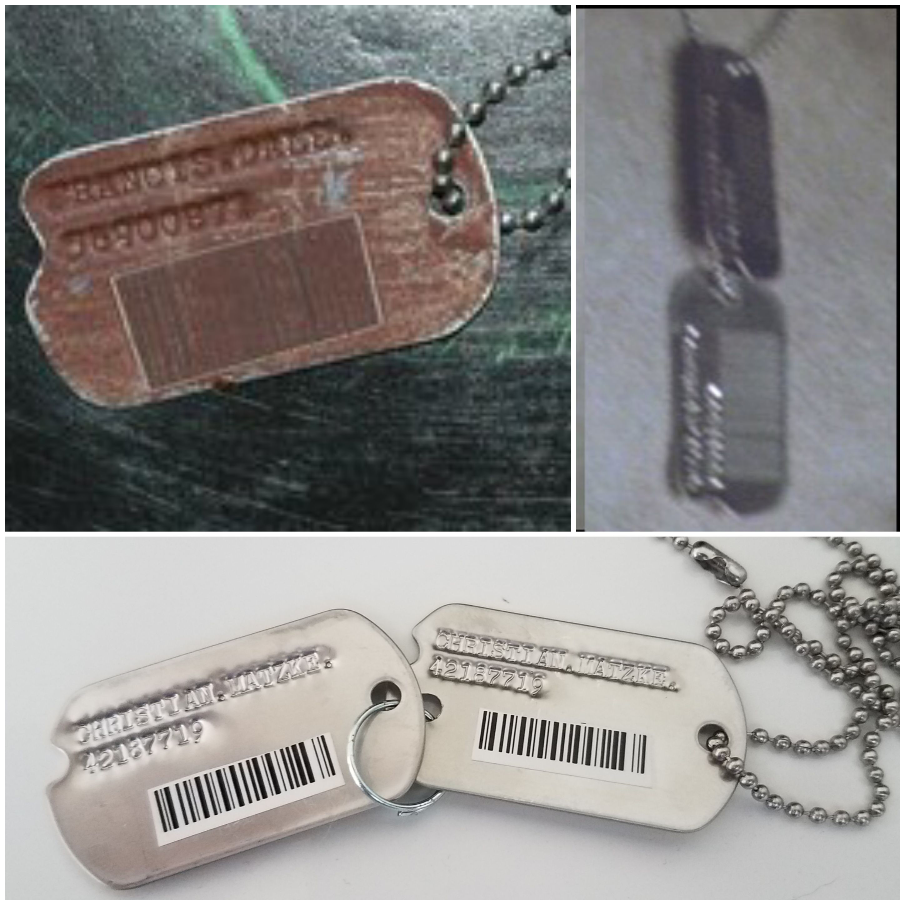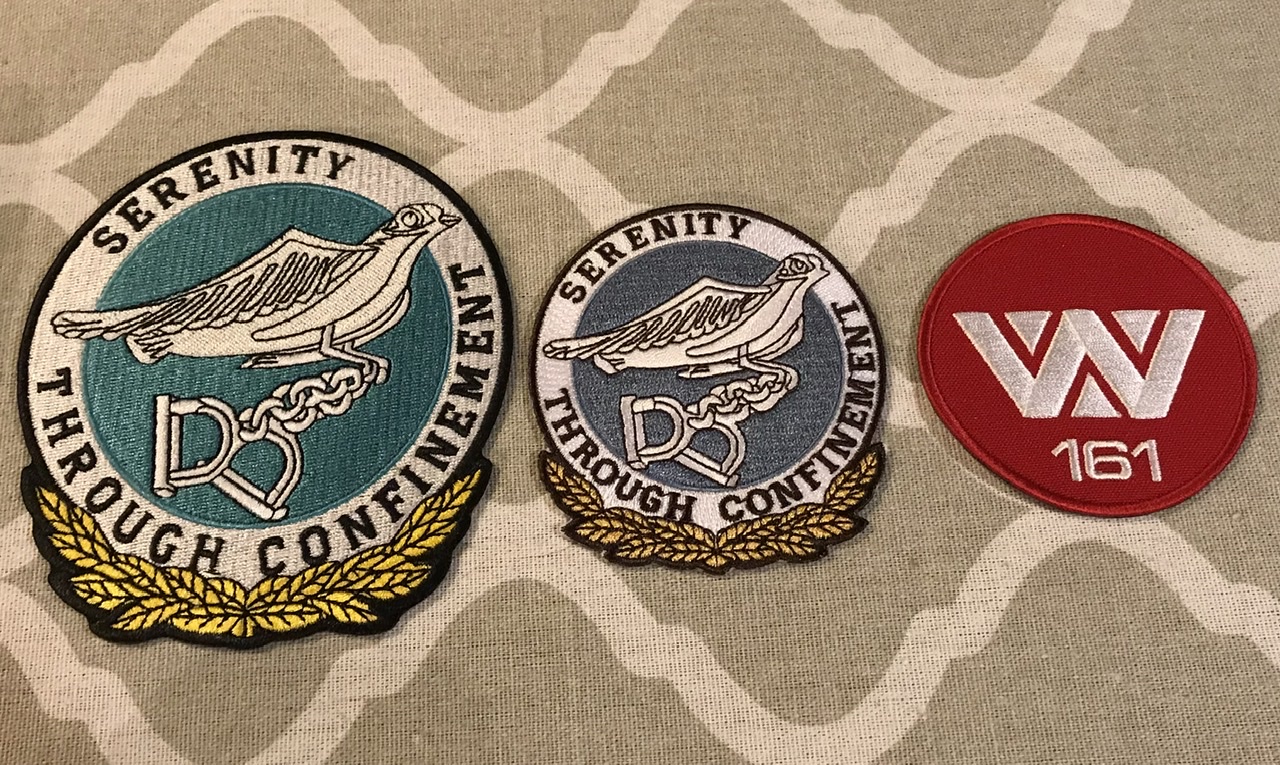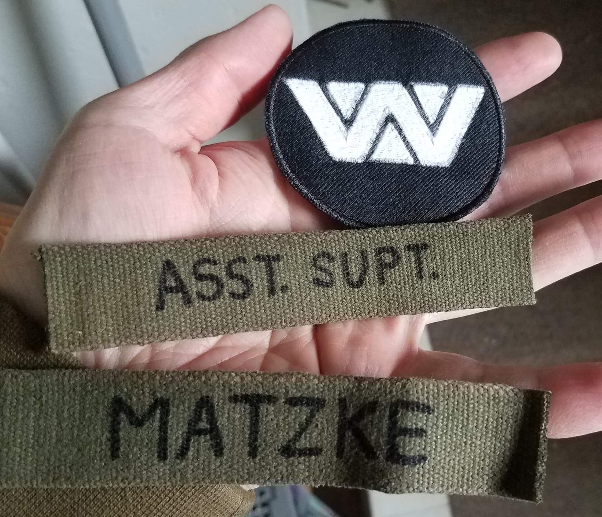 I'm still looking for fabrics that are close to what was used in the film with respect to texture and color. Once I locate appropriate fabrics, I can then sew them into my clothes. My aim is to create something that emulates the prisoner costume as closely as possible. The long cloaks in the film were, as far as I can gather from interviews, produced for the film. I would speculate that this is also the case for the shorter partially quilted tunics. Based on what I have read on this forum, the trousers were also made for the film. I have some clothing items (e.g., olive sweat pants, grey sweatshirt) that are 'close' to those in the film. They need to be distressed and stenciled, however, to bring them closer to the look of the film. These name tags are a step in that direction.