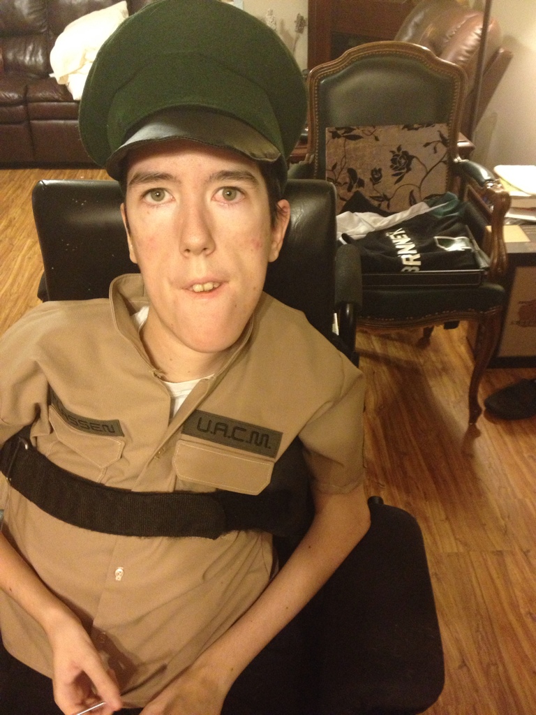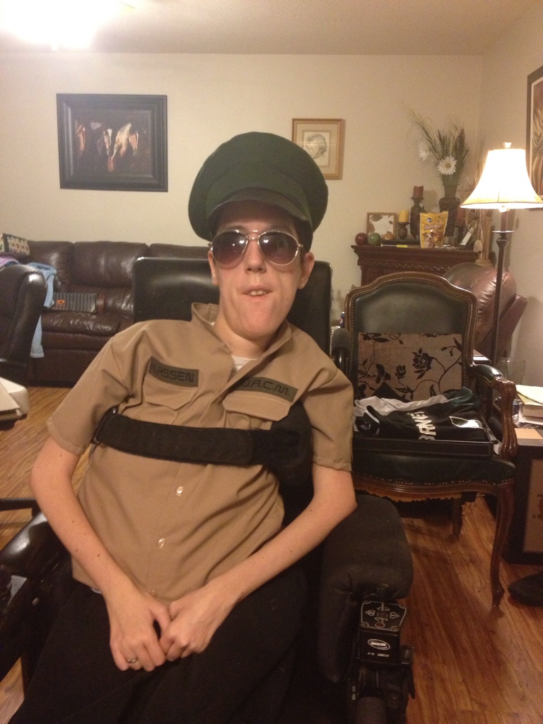 I haven't felt much like doing anything, although I will probably still donn my shirt tonight incase we get any little ones coming trick or treating. I do have a sad but funny attempt at the homemade visor hat finished too. The pants will have to wait a bit longer. I will just have to wear some black pants or something haha.