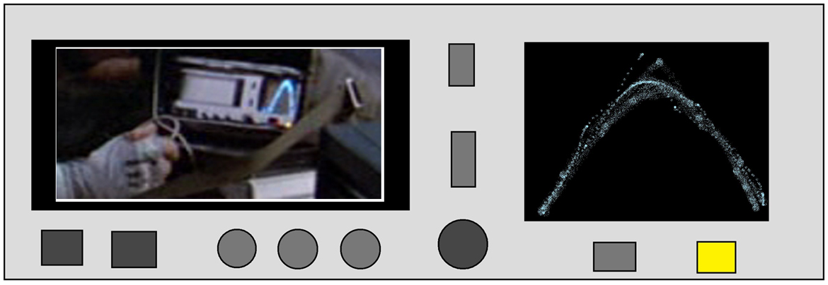 This is what I can make out at least. On the right is an oscilloscope, and on the left (where I've placed the screen grab) appears to be a paper read-out from a heart monitor or somesuch. Just below the oscilloscope is a square yellow light, and then there are a number of round and rectangular knobs and buttons.