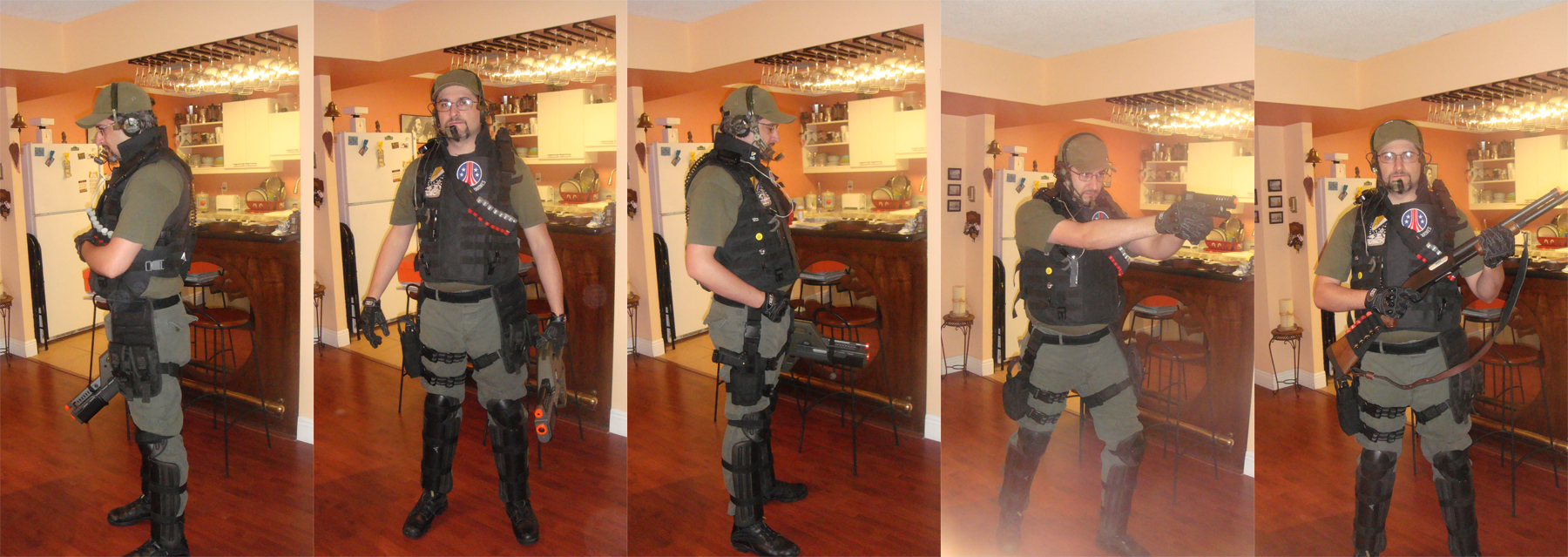 i experimented with different pouches and im still undecided on which pistol to use. one is a 1911 with a front comp the other one is more of a hi-capa type with a lam on it. also im pretty much in love with my shotgun (which ill use as is until i can get the funds to make it into an ithaca)