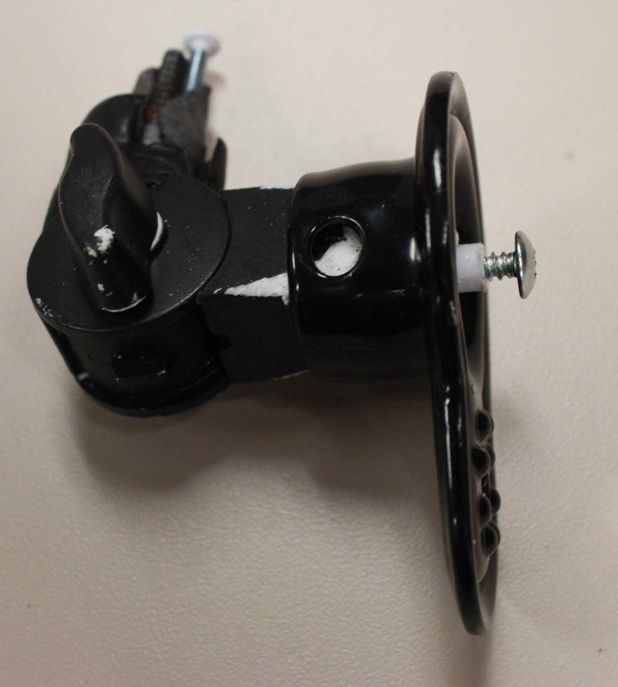 The base is part of a McFarlane Toys display stand. I gutted it to make it less heavy. The handle is cobbled together from part of a packing tape dispenser and the sides off the top of a VHS tape rewinder with a lot of two part epoxy and a few coats of black rubber spraypaint. The arm is PVC pipe, the joint from a clip fan, and a piece of a toy gun.