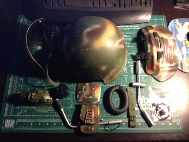 I bought a Spat helmet off DBoz as I need to outfit the Sarge in my miniseries. My own Marine helmet is a vintage pot with a HORPAT cloth cover, Spat camera, ear defender and lobster plates, and an improvized lobe plate. This one is a metal pot too, but it is fun to see how Spat attached all the various pieces. DBoz included an outstanding Mars Attacks Beyerdynamic clone, which I promptly snapped in two :x