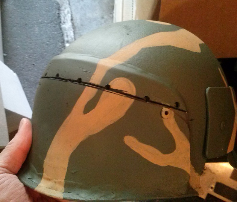 Thanks Nick! You've been a huge inspiration to me so that means a lot. Here's a comparison of the before and after with Osmotic's original as a reference: Attachment: So it is clearly much closer to screen accurate, but I can spot at least three big differences, the width and angle of the cut for the ear defender being the most obvious. I'm just going to have to let that one go though as I can't see rebuilding the edge of the steel pot. I can always claim the Sarge did a little field modification on his gear. Charlie: it took me a minute to get your reference, but then I remembered you did Mandalorian armour! So yes, I have indeed made a dentel helmet: Attachment: The paint job will make or break this particular detail, but hopefully it will look cool. Next up is a fresh coat of OD on the areas I've rebuilt. |