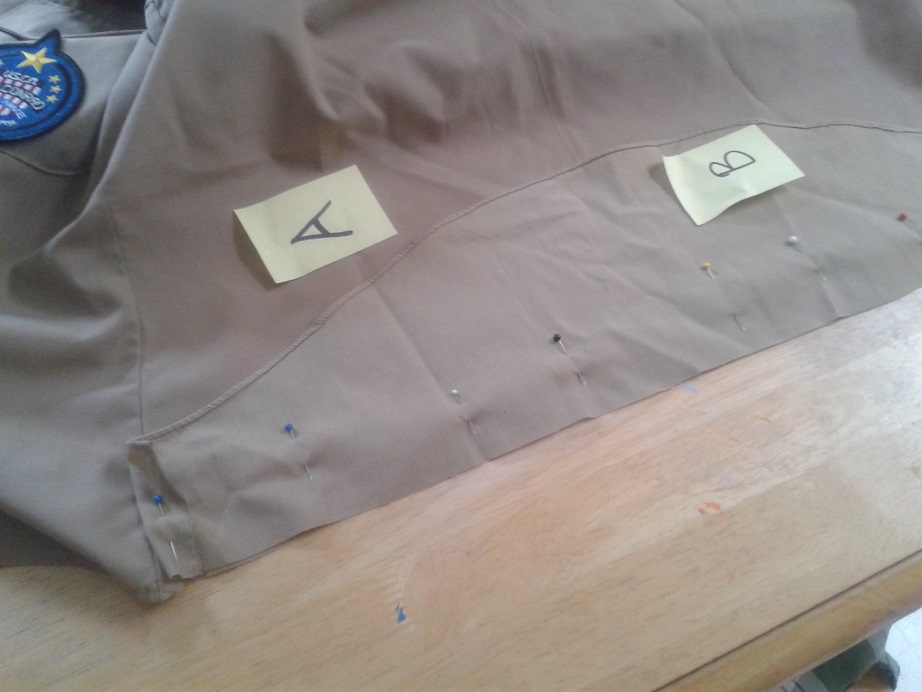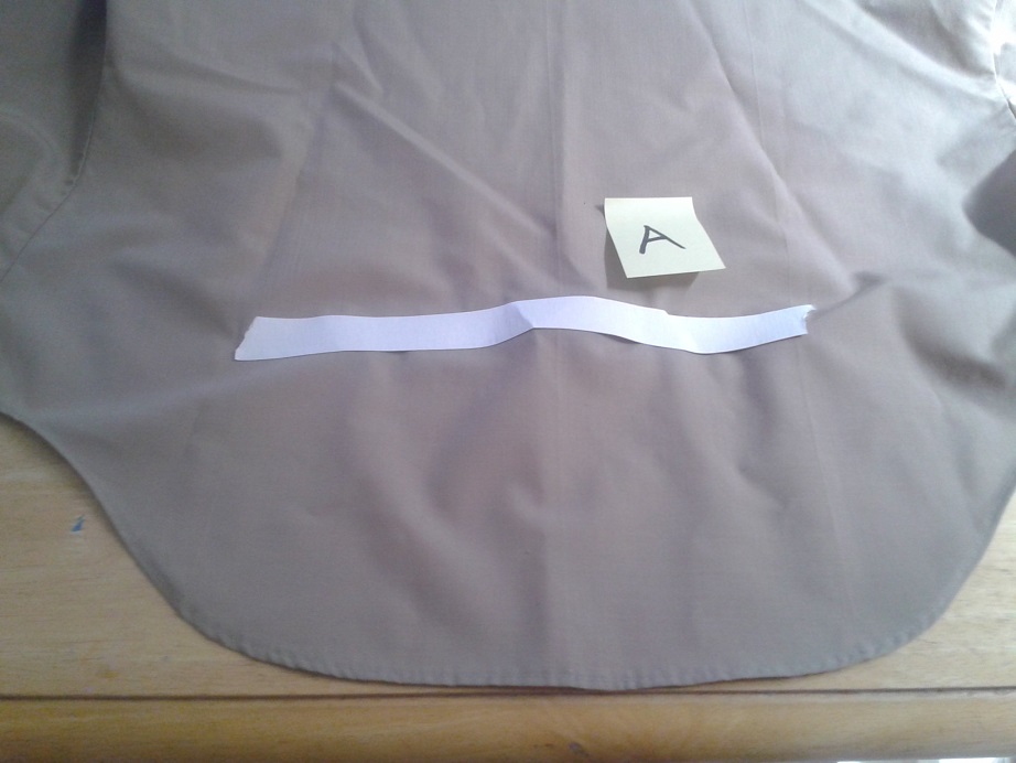First I put the Service C shirt (marked A in the photos) on and had a friend mark the back where it tucks in to my trousers with a piece of masking tape.