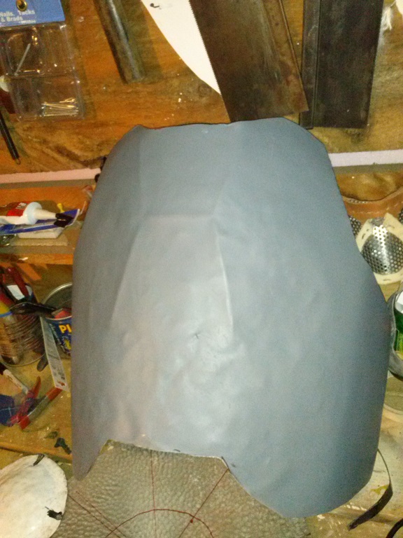 We opted to do the "steps" (which he calls Lames) as two pieces that would then be riveted to the breastplate (where the grenade straps would hide the join) and then blended with Bondo or SteelStik.