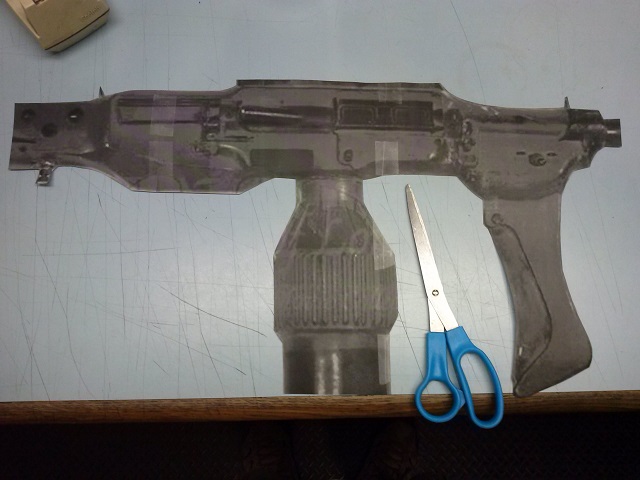 Armed with some measurements from Bigbisont, I enlarged the photos from the Prop Store and made a lifesized cutout of the gun.