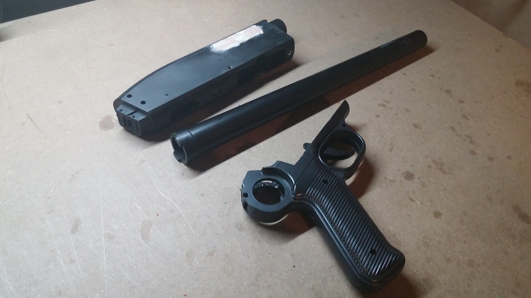 I got the bright idea to get the real slide assembly to pair with the real forend. I got the even brighter idea to buy a beat up one to save money. WOWZA. I didn't expect it to be this bad! The nut on the front is rusted solid so I can't get the ribbed forend off to even get to grind/scrub/clean it. Going to have to put in some elbow grease on this one... Attachment: Attachment: Attachment: The plan is to make it so it has a racking action, but I doubt it will be very 'satisfying'. There will be few, if any, metal parts inside the receiver. At minimum I will have something inside there that keeps the tension on the arm so it doesn't slide around on its own, but still gives so it can be racked. Anyways, almost there. Waiting for one more 'real' part (a 'yoke' that keeps the barrel aligned with the mag tube) before I slap it all together. |