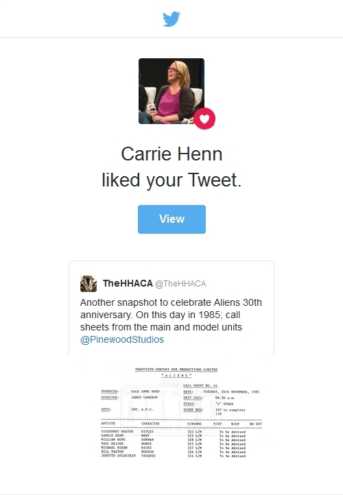 I recently posted one on Twitter, tagging among others Carrie Henn, and she liked the tweet! It always means a lot when a cast or crew member reacts directly to something like this, I'm very happy!