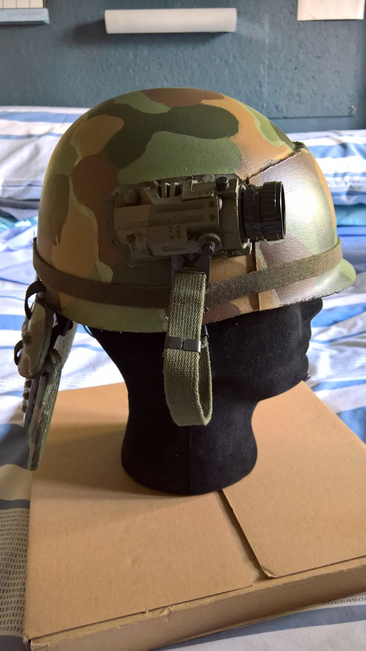 seven wrote: Been waiting for an update on this. I like the hook idea on the shin guards. maybe a loop with a snap would do it. I'm not much of a painter but I would darken it quite a bit. maybe use multiple earth tones coats in an airbrush.just rehashing what reaper said. I really like how geometric and bold the camo looks. I'm thinking if you put it on a manequin with BDUs youd get a good sense of how weathered or darkened it should be. Wanna see what youre gonna do with the helmet This is the helmet I have. It's just a hobby project I put together a couple of years back and repainted as part of the upgrade. It will need replacing for an accurate earpiece. Note that since these photos were taken I have painted over my name on the back and reapplied it much smaller.
