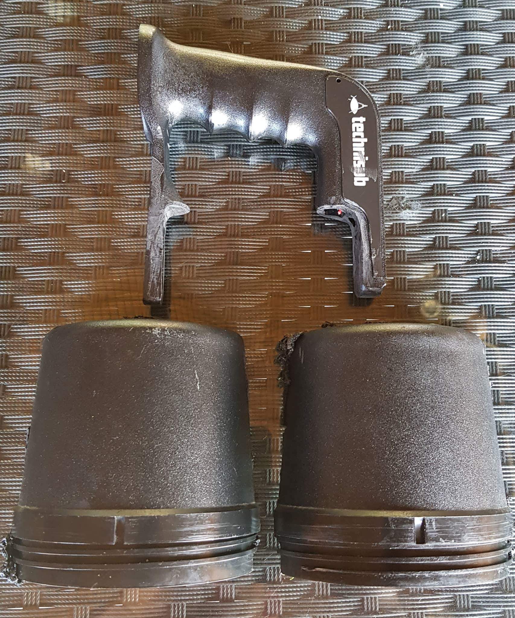 I used a 8mm threaded rod for the lamp arm and a 5x30mm allenscrew for the handle to fix it all in place,and its not moving.I will also be putting some small screws in from the inside throught the box into both sides of the grip just to stabelize the handle and allso a small grub screw in the small part of the light arm from underneath just to give it all more stabilitey becouse sooner or later from the weight of the lamp arm it will all start to wobble and droop.
