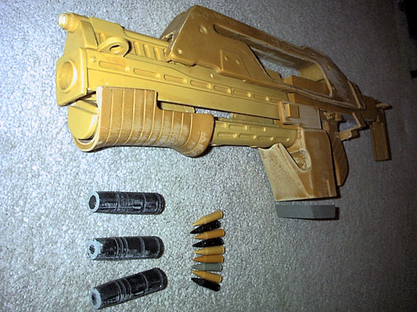 Looking primarily at the grip and the sling loops I'd say this was a recast of the Marco Ent. Pulse Rifle. I do have one of those but it's somewhere in storage, however I just found some images in the ol' archives. They don't belong to me in terms of copyright so if anyone recognises them I will of course remove them or credit the owner.