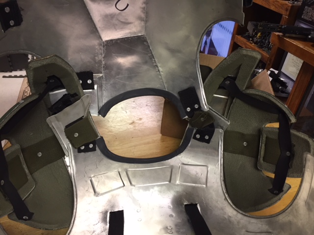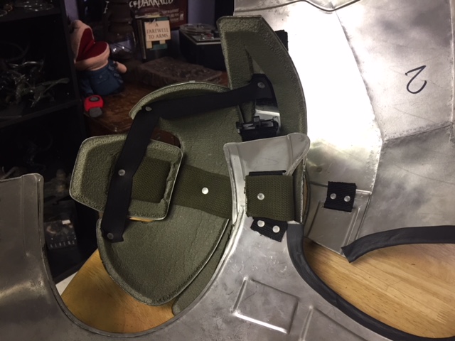 Not sure how long he has been doing it (clearly he wasn't doing it in the above pictures), but he elongated the webbing/elastic that used to just hold the center tab into the shoulder bells. Now it starts at one side of the bell, goes under the center tab, rivets to the other side of the bell, then continues on to connect to the same rivet that secures the fastex buckle connecting to the grenade strap. It all keeps the shoulder bell facing forward. Pretty nifty.