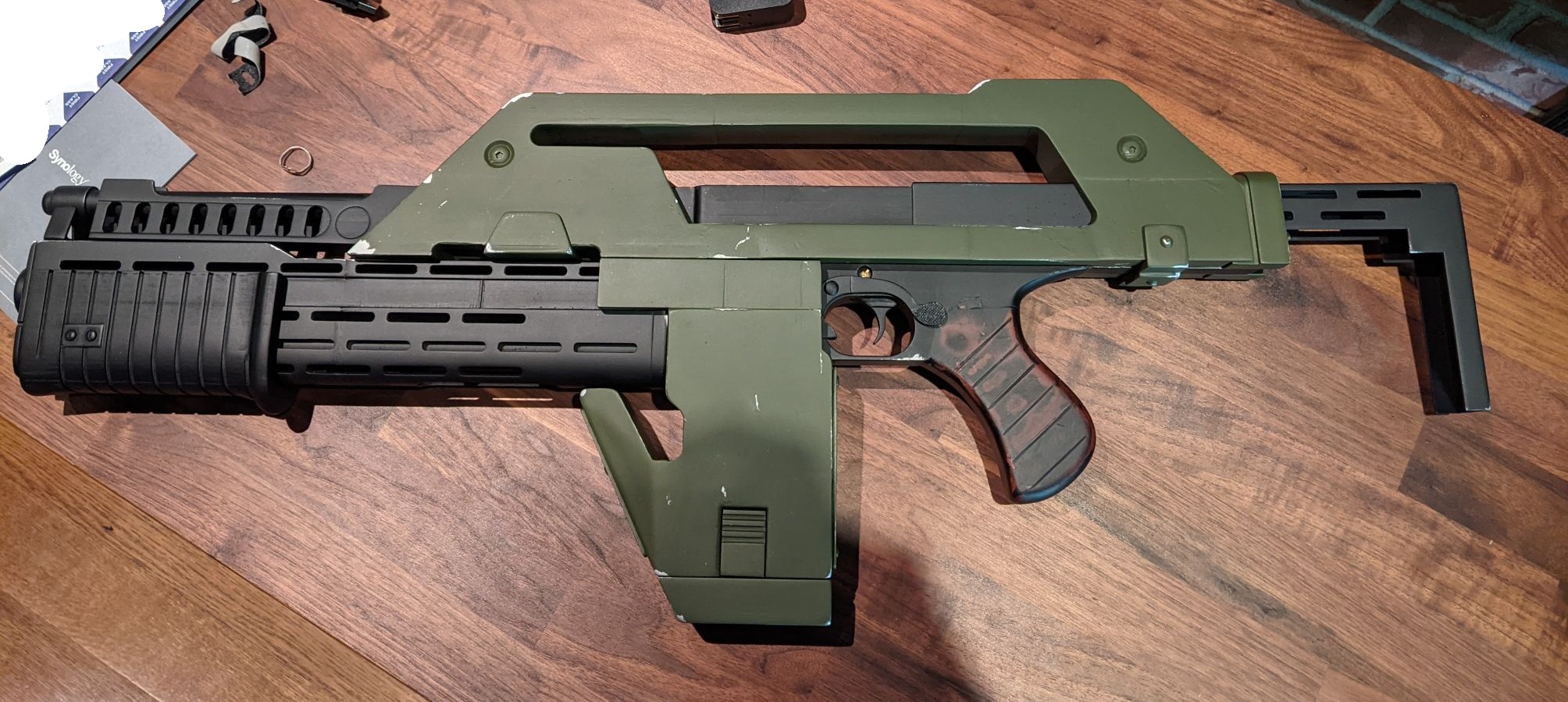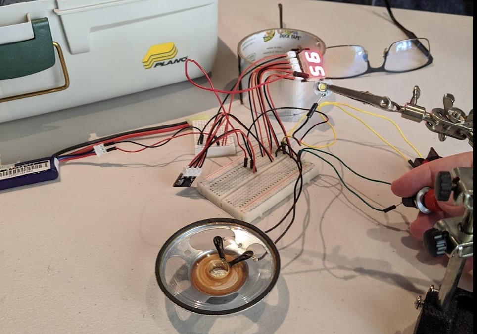 The upper shroud had three sets of wires coming out of it - the trigger, the on/off switch, and the muzzle LED. In the lower shroud I'd be adding the speaker and the battery power, and then it'd all be wired up to the Majenko counter & LED control board. As I'd been assembling sections and pulling wires through channels, I'd been using a multimeter to make sure my wiring was good.