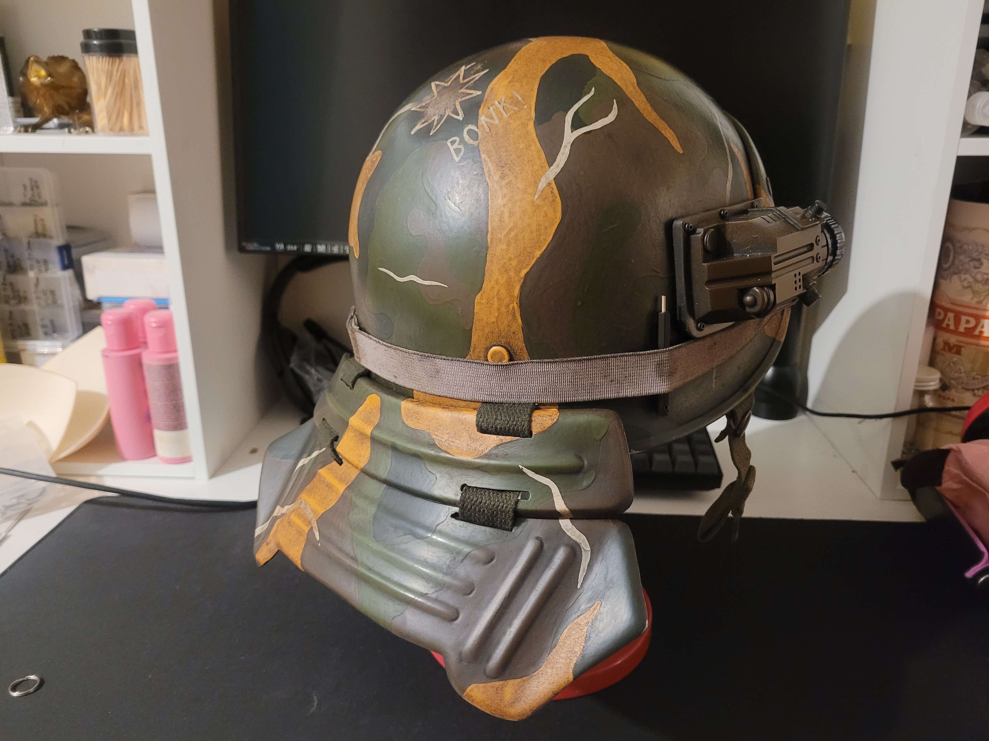 Finally got working on my helmet this last month Full list of credits The austrian army for their knock off M1 helmets James Forder for the helmet camera, ear cup, microphone parts and for donating his old lobster plates. Neil Storey for the ear flap Doug Mac McCarthy for all the painting advice. Corey 'Prev' Fanselow for graffiti inspo and good company Final list of customisation: Grey helmet band Tiny hex driver tucked behind the helmet cam (the same as the mounting bolts for the helmet cam) Bronica lighter cast between the bump plate and ear flap British bombadier pin over ear flap Dinnae Fash on bump plate Bonk on the big dent NOAA and Navy Aviation RFs on the ear flap. This was a lot of work but great fun. Took me about a month of scattered work with a few breaks while I waited for things to arrive in the post. the only thing left to do is add my name to the rear. I constructed the bump plate from scratch out of PVC foam board and did all the painting, weathering and finishing myself. I have thoroughly decided that I hate Manganise Steel as it's awful to cut through and even worse to attempt to drill or grind a hole through. One of my favourite features is that the helmet can be completely dissasembled if need be, The bump plate, lobster plates and ear flap are all held on with chicago screws, the ear cup and flap are connected with bolts, the mic is friction fit in place as is the insert for the ear cup with the pad on it. If I need to I can strip the entire thing down to fix or replace anything. This will be extra useful as I someday hope to replace the plastic bump and lobster plates with Aluminium, and I'd like to be able to replace the ear cup or mic with more accurate pieces if the opportunity ever arises. The only glue applications on the entire thing are inside the helmet camera where I installed an aluminium connector for the Pentax that came with mine, the construction of the insert for the ear cup which I scratch built out of ABS, and the small cut off of the tool casting on the bronica that's glued to the lighter casting to make it look like theres a tool in there. Even the mic tip is attached to the boom with tiny screws and is removable if I ever need it to be. Anyway Hope Yall like it. I'm excited to start on my armour soon. Planning to scratch build it out of Foamex board (expanded PVC Foam board/sinage board/sintra) using the pepakura templates. I also updated my carry box and have some better pics of the bronica casts below too.