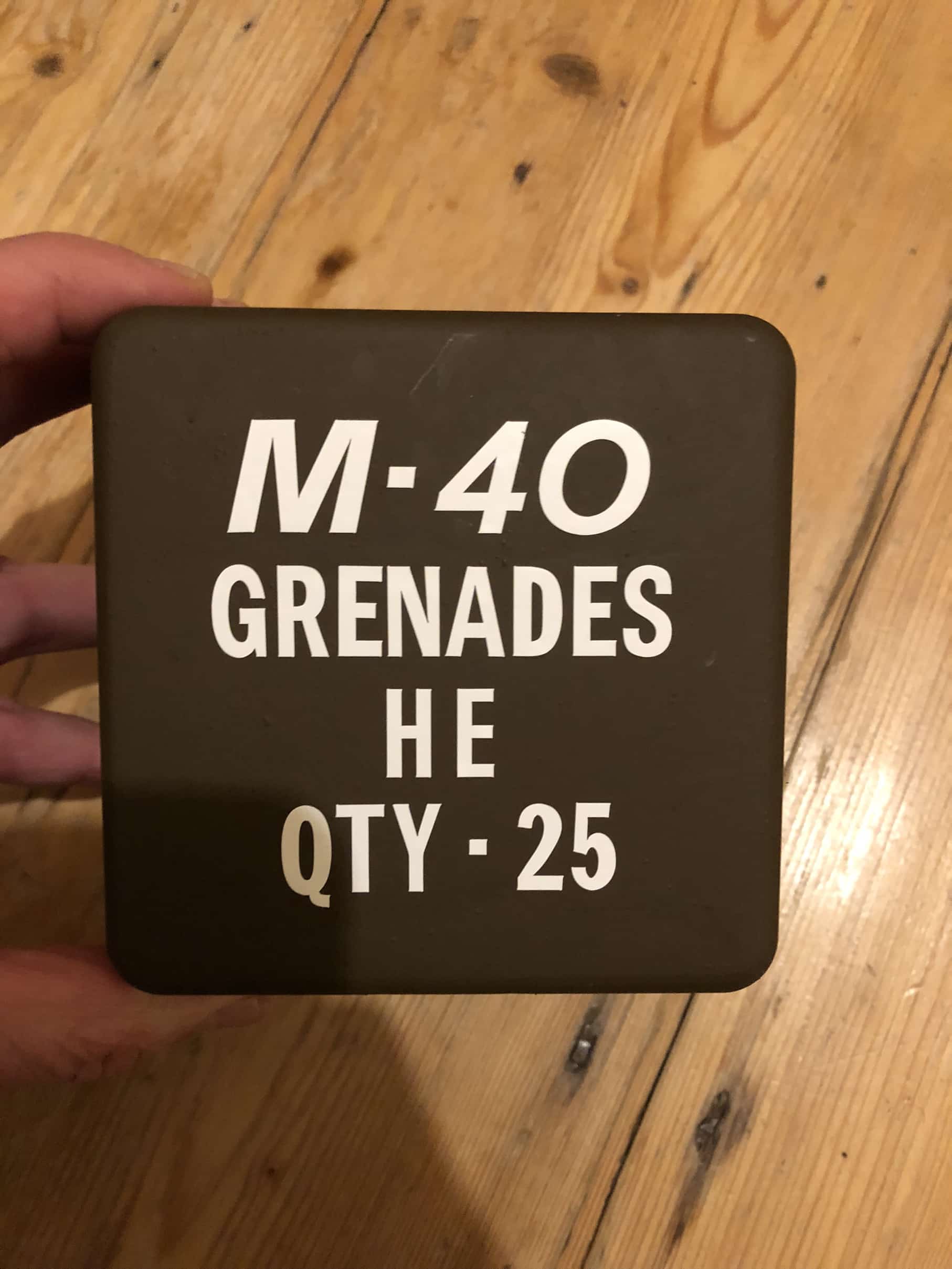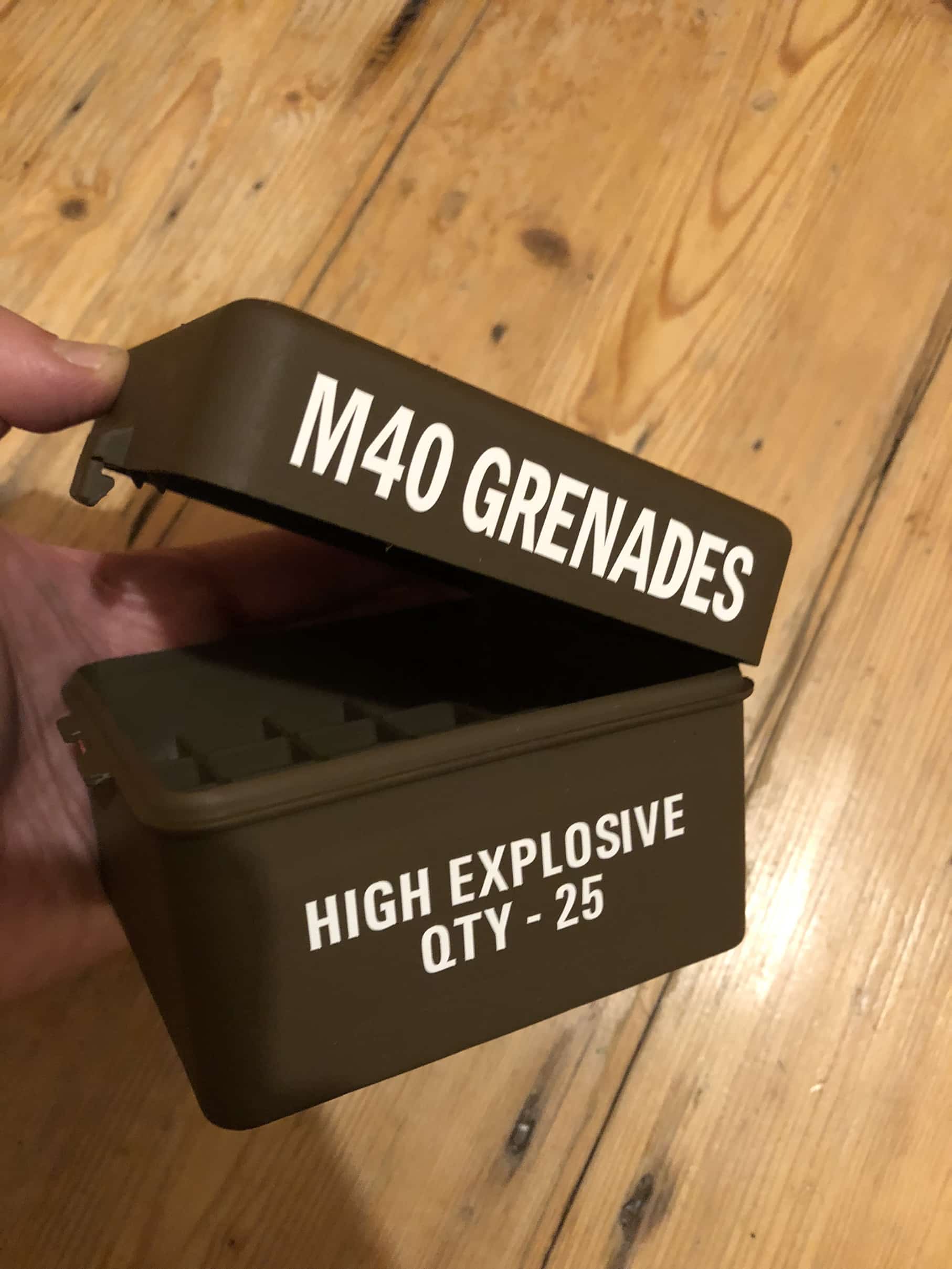 I got this MTM CASEGUARD box… it’s the smaller 20 Gauge type but as it happens it fits the M40 Grenades for the Maruzen M870 perfectly… stickers were shrunk in design by MOOSH and a friend cut them… painted the box in SCC2 Service Brown today… just some varnish to add