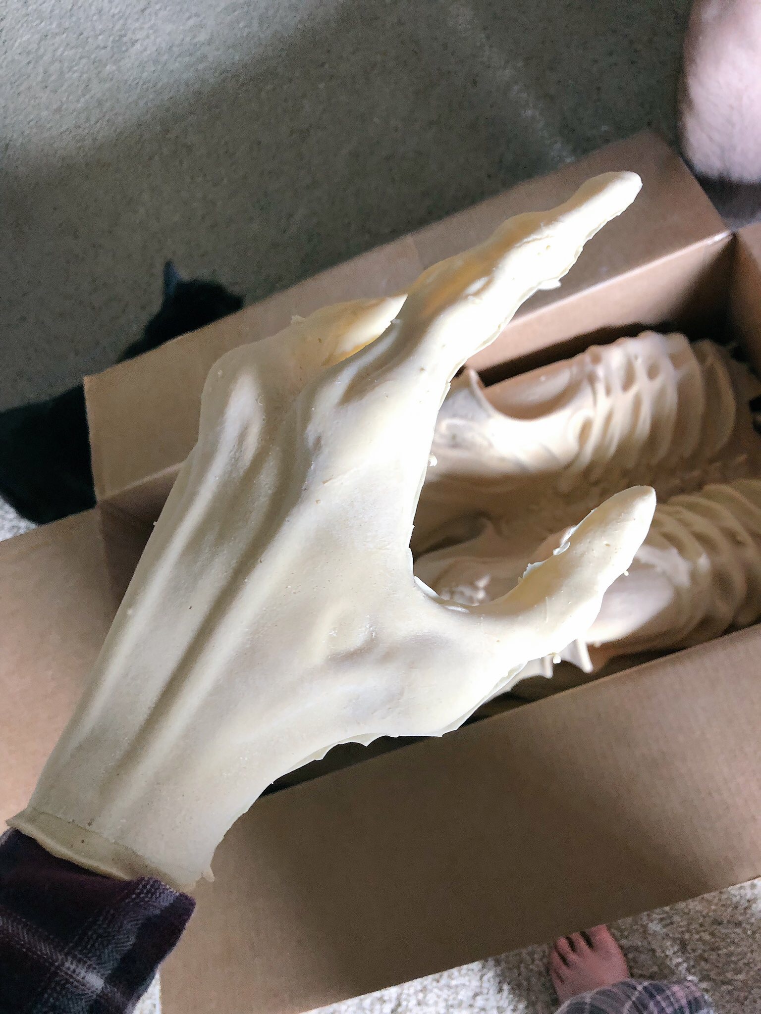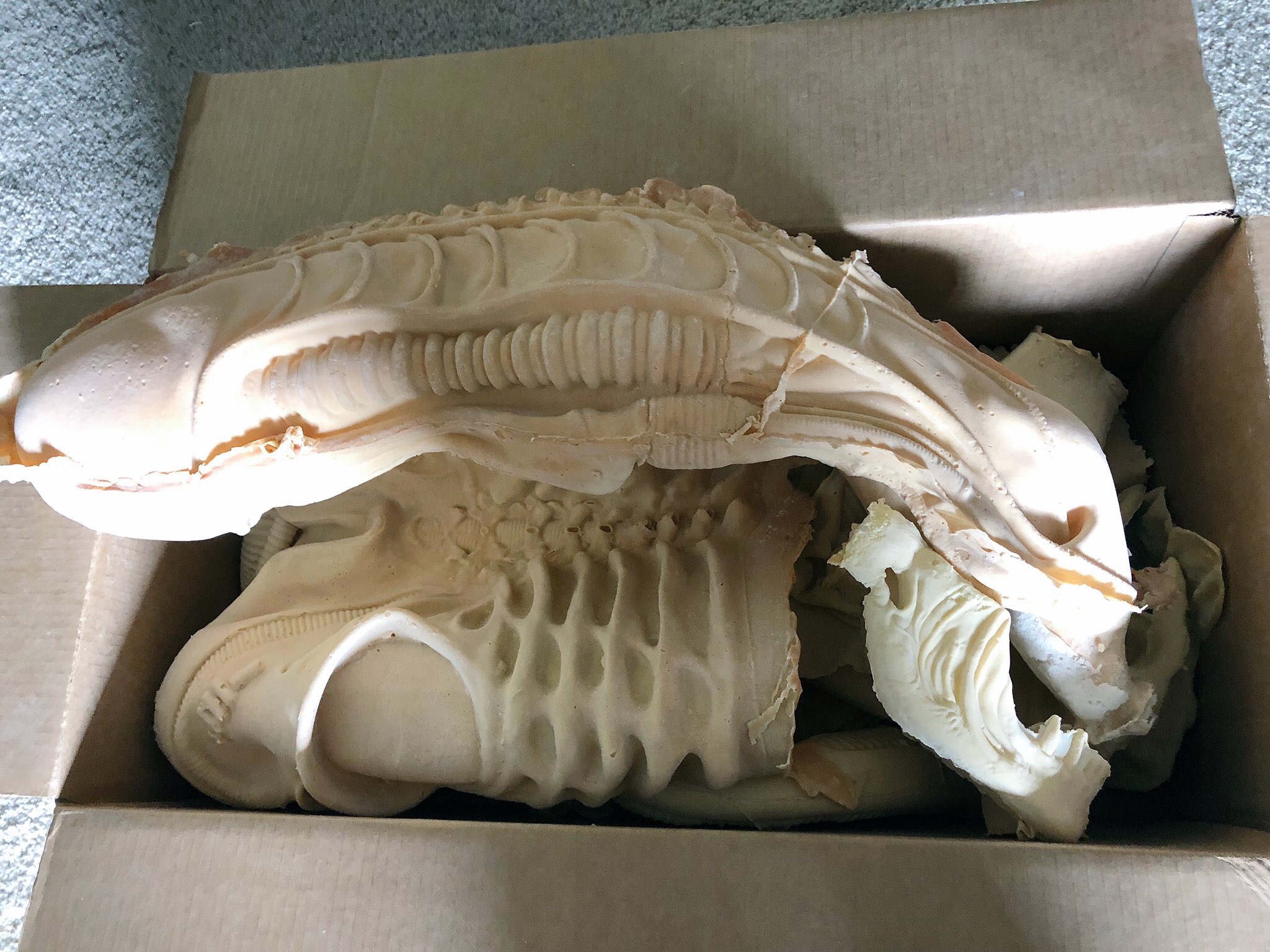 In the meantime, here’s the head with some roughly pinned on teeth! It still needs a wash and then some filler/repair with liquid latex
