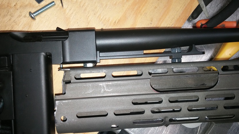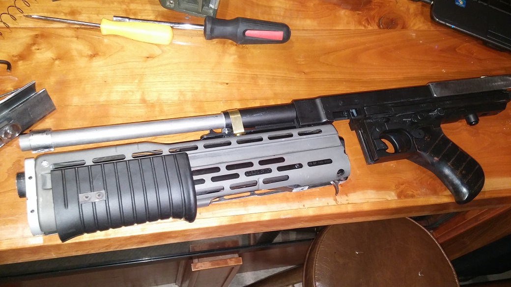 I attached my GL but bolting it right to the same support for the regular thompson front grip. I left it as in tact as I could and even used long bolts with the same thread pitch to use the same holes. I did reinforce the front with a brass 'strap' that was riveted in place to keep the lower bracket from sagging forward.