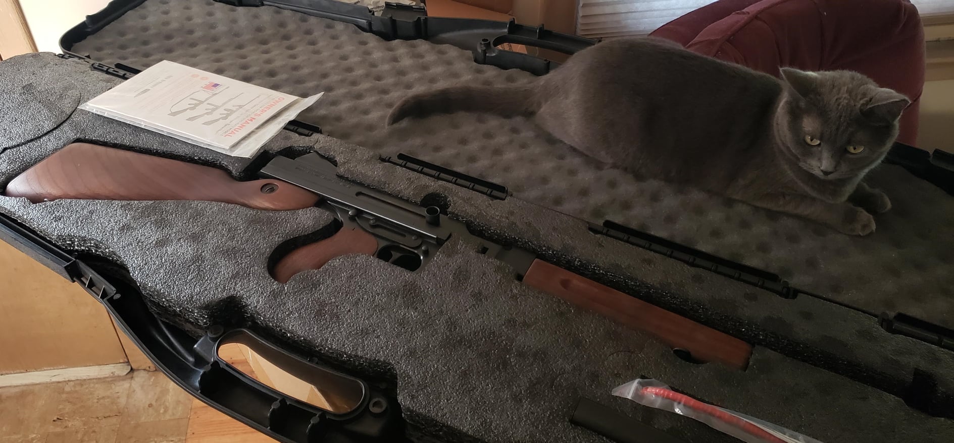 Base gun - Auto-Ordinance M1 Thompson (semiauto) with shortened barrel (Registered "Short Barreled Rifle). Only mod besides shortening the barrel was to turn down the barrel and add wrench flats for easier assembly/disassembly.
