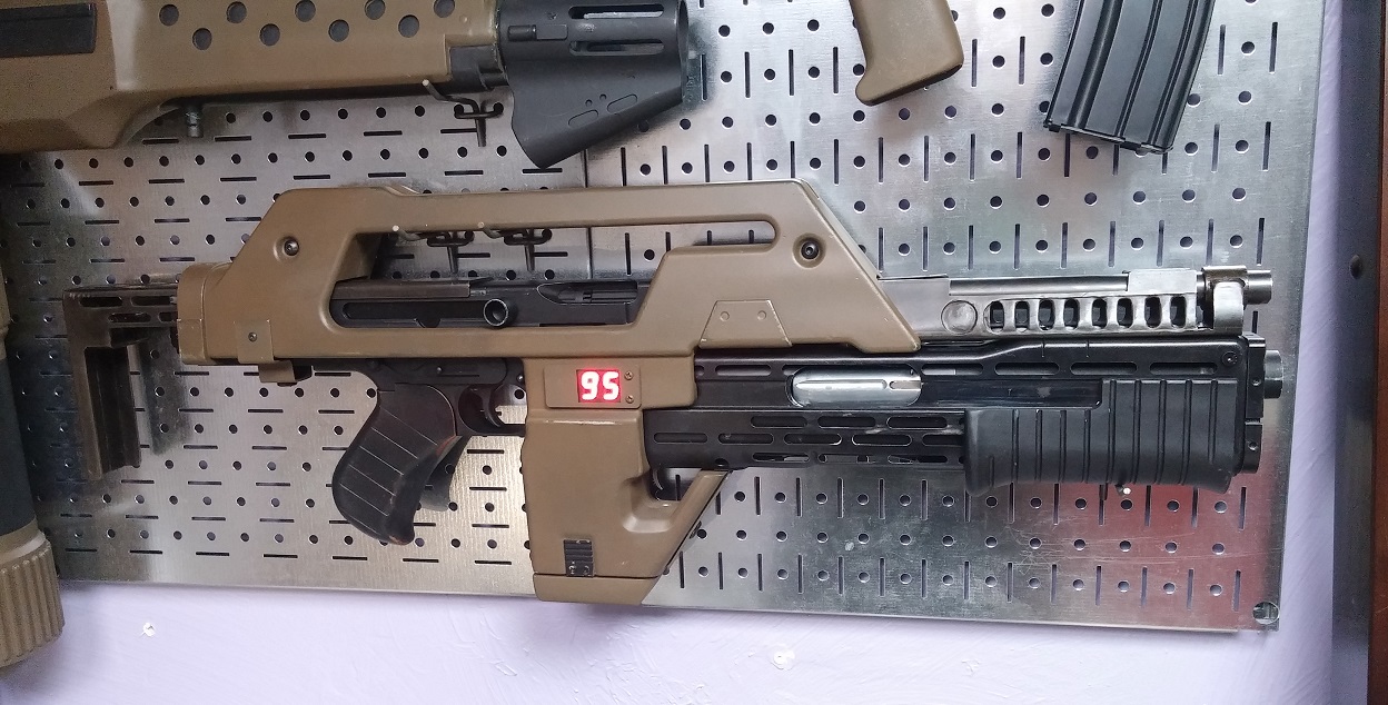 Well, I documented this build pretty extensively in in my "pulse madness Hero-ish" build thread here but these are the bullet points. Features: -Real SPAS parts, HCG Metal shrouds, SD GL block, & Scratch built stock/vent/mag base -Uses King Arms Thompson and APS Cam870 (shell cycling) airsoft guns -Majenko Ammo counter/board I still need to re-weather it after I repainted it. Attachment: Attachment: (Full build thread can be seen here viewtopic.php?f=3&t=15035 ) |