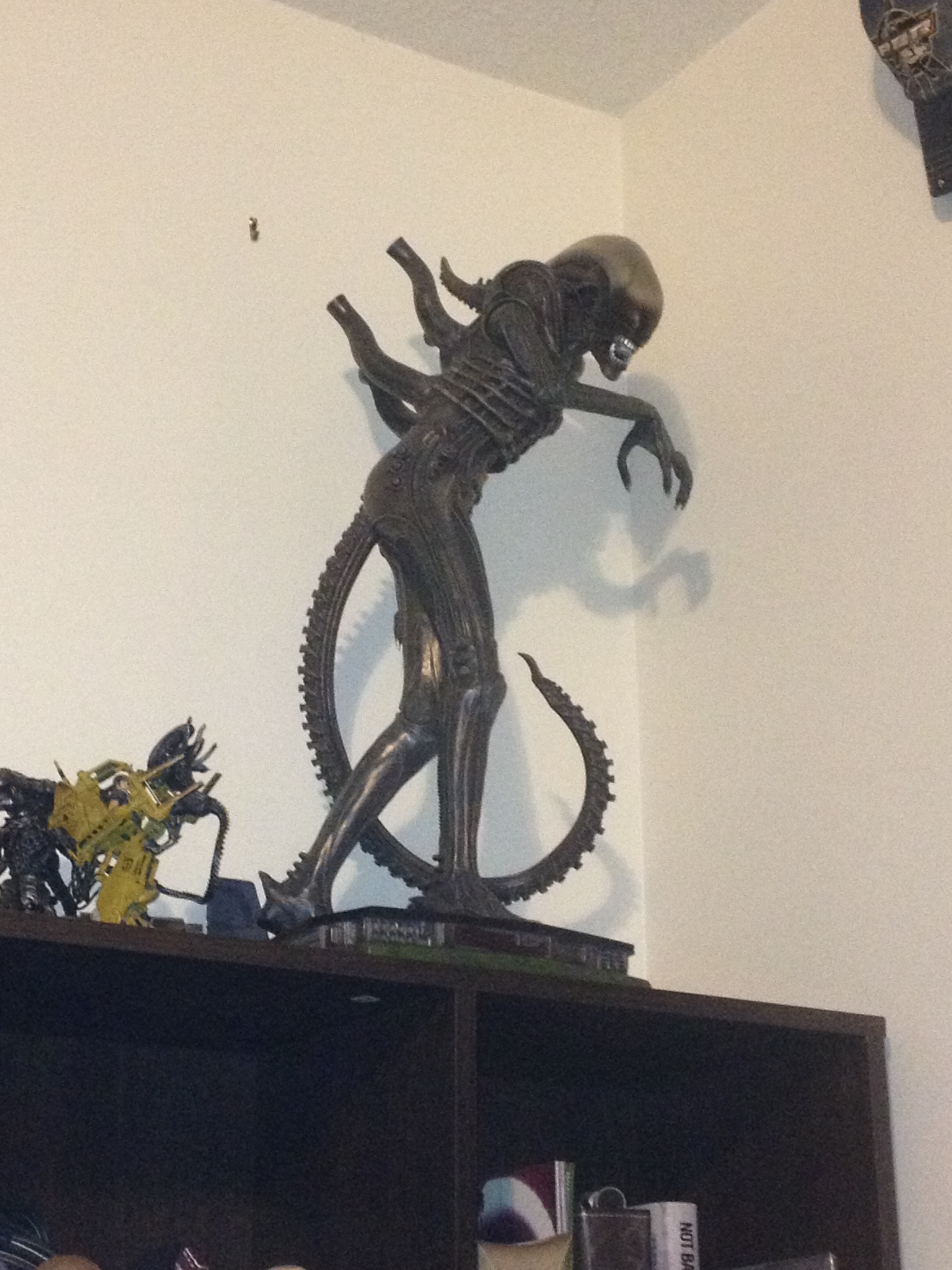 I asked him "Is it Aliens related?" and right away he answered back "Nope!" haha. This kind of solidified my suspiscion that it was in fact, Aliens related. When he said it was a collectors item was the first clue. Also, knowing him I figured it had to be pretty expensive. The next night we were Facetiming on our iPhones when he asked to see my shelf and my desk. I heard a little "Hmmmm" from him like he was thinking, so I knew it had to be something fairly sizable, and a display of some sort.