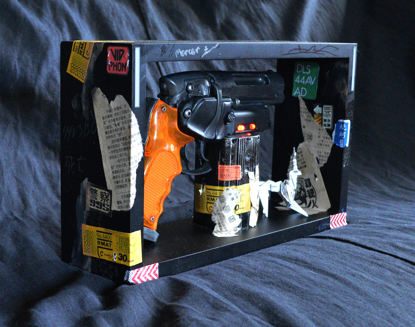 I lucked out on one of those inexpensive Japanese squirt guns ("Fullcock" brand!) so I decided to mod it up with lights and metal replacement bits. Once that was done I decided to make a little display out of a shelf/shadow box from Goodwill and a bunch of Tom Southwell graphics from the original film. I'd been holding on to an old Chinese newspaper so some bits from that rounded it out.