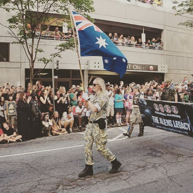 Back in 2006, a USCM flag was created for a specific purpose- to simply help identify the group during the parade. During the first years of the parade (2003 on) we didn't have anyone in an Alien costume. We ALWAYS got called "Starship Troopers" or GI Joe, or frankly anything other than "Aliens" or "Colonial Marines." IIRC it was carried by Tony Leach the first year. There was no Colour Guard, no other flags, and (correct me if I'm wrong) no one even wearing Service Cs.