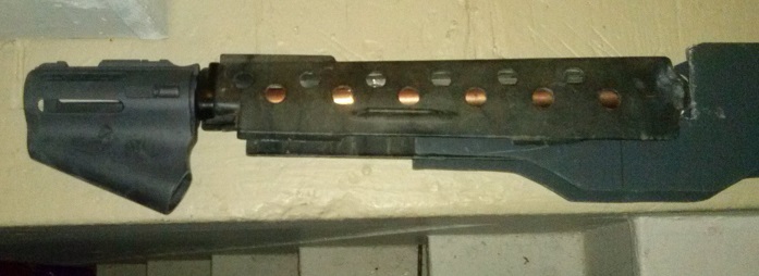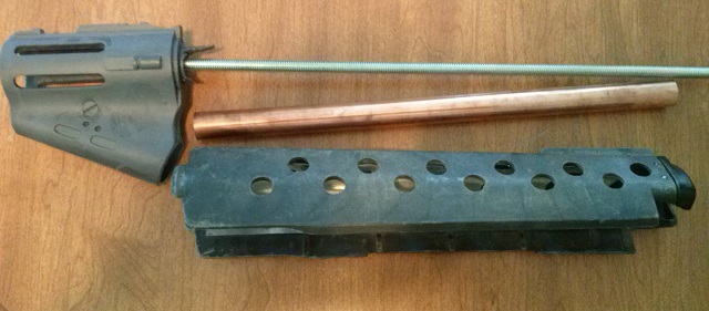 And a closeup of how the pipe looks inside the M203 (this was a lazy shot and doesn't reflect the exact placement of the pieces). My plan is to leave the bottom open until the front section is done and painted. That way I can sneak a shield inside the M203 to protect the copper pipe during painting. I'll then pull it out and finish off the bottom with some plastic sheet.