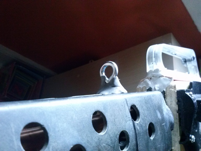 Sorry for the fuzzy pictures, I was rushing to get this part done (which of course came back to bite me). So first I drilled out a hole in the resin front piece for a threaded rod to fit through. If you look carefully you'll no doubt notice that the horizontal vents in the front are not level with the length of the rod. Oh if only I had noticed this early on...