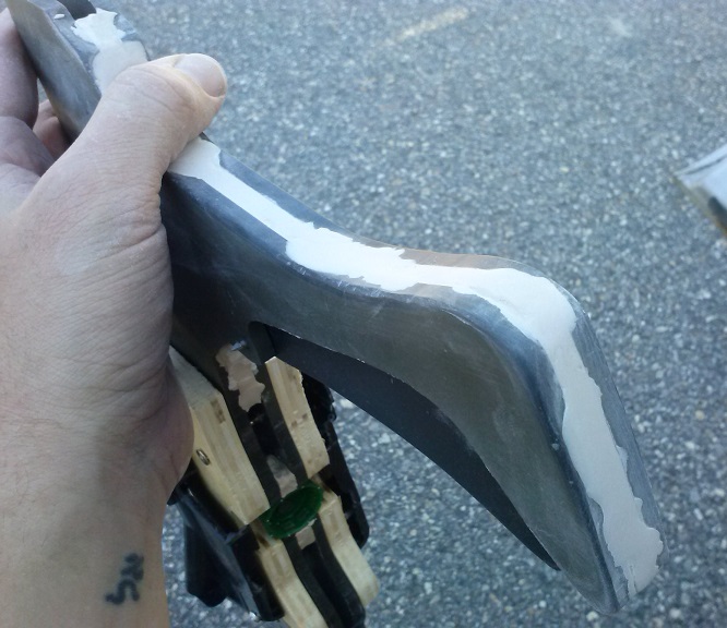 So then as the putty was quickly setting up nice and hard I realized the angle I'd drilled into the resin piece was wrong and making the whole tip droop. No one likes a droopy tip, so I pulled it apart as much as I could and bent the rod right where it met the resin (it had already bonded inside the piece too much to free it without risking breaking it). Luckily, this seems to have fixed the problem. The rod doesn't go through the center of the plexi body in a straight line (it angles up toward the back of where the carry handle will go), but who cares? Once it is screwed and puttied in place it won't matter. The plexi also continues up under the back of the M203, so that will be a second area of support for the front, and then finally the back (including the last few holes) of the M203 is encased in putty, creating a third support. Here's a test fit with "fuel tank 2.0" held up for comparison.