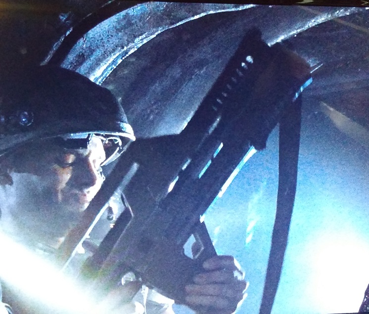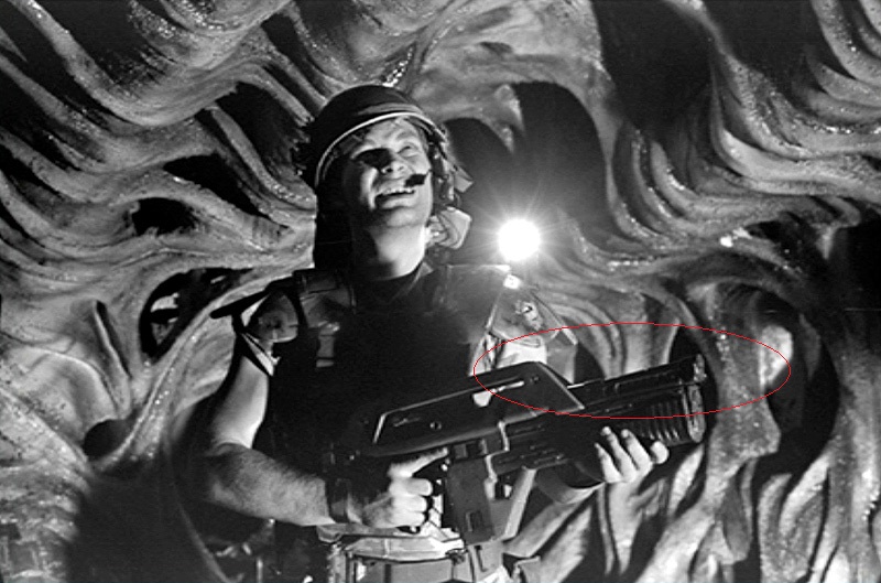 I am still a bit obsessed with this topic and have been doing some digging. Last weekend I went through the entire movie and tried to get a screen shot of every pulse rifle to appear on screen where an identifying detail might be visible. My method is very inexact (taking pictures of the screen with my phone) so please forgive the crudeness and lack of photo quality.