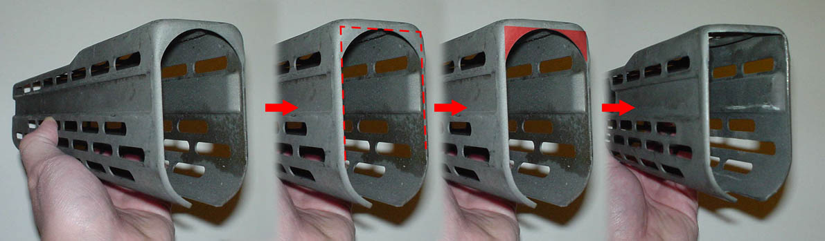 * Front of the cage:The first cut you need to do is at the front of the cage to allow the Grenade Launcher Front Block to slot into it. (In all the pics in this pictoral guideline, the first pic is the unaltered cage, the second pic is the rough guidline as to where to cut, the third pic is the material that would be removed, and the final pic is the altered cage.)