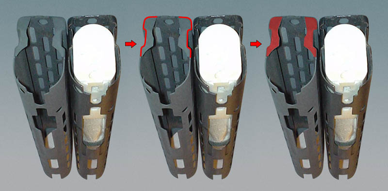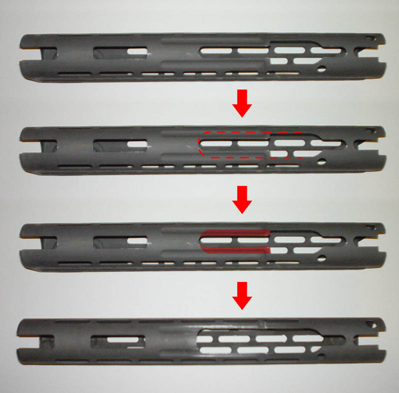 * Left side of the cage:On the left side of the cage you need to remove three small sections to allow the pump grip's racking mechanism access to the inside of the cage.